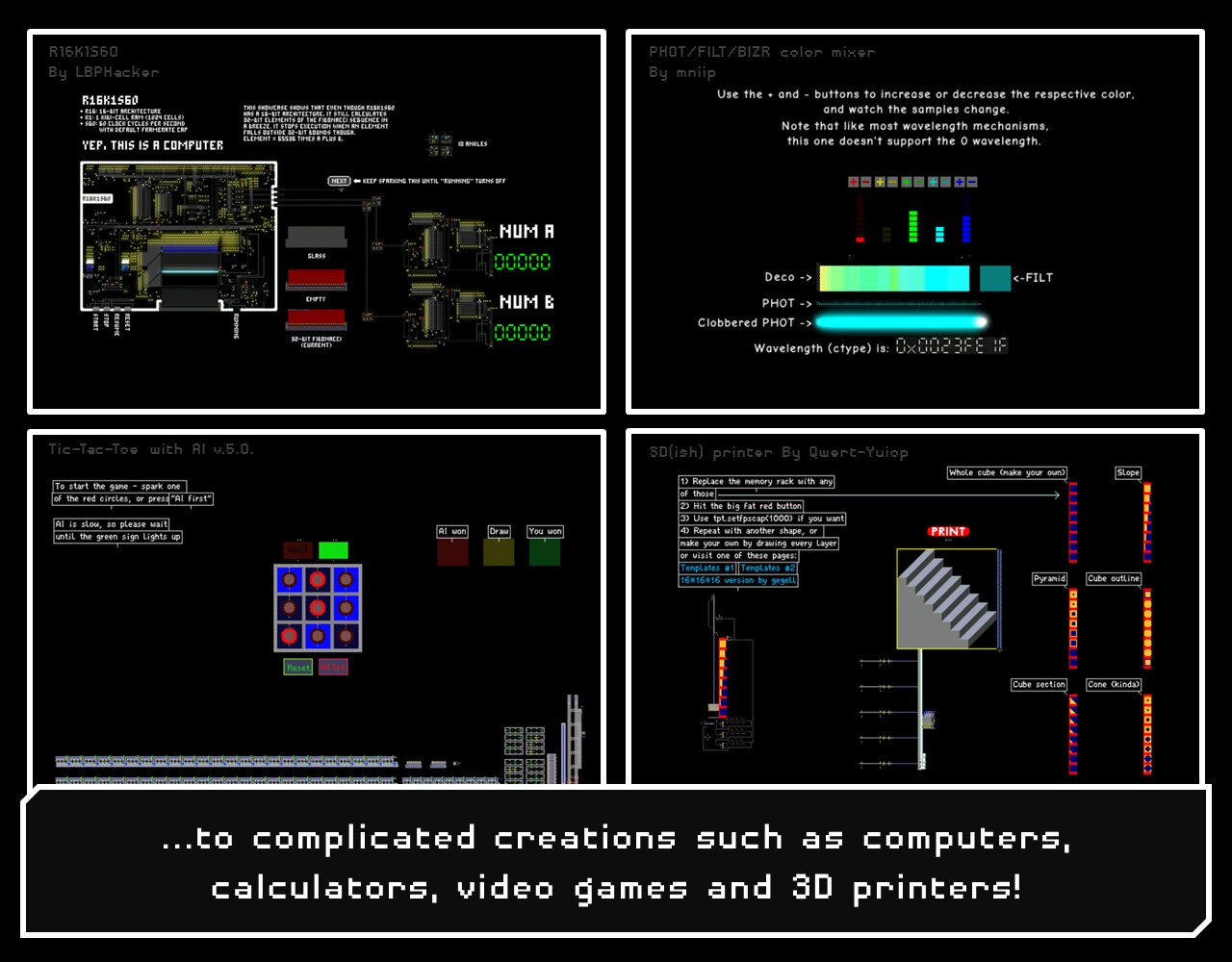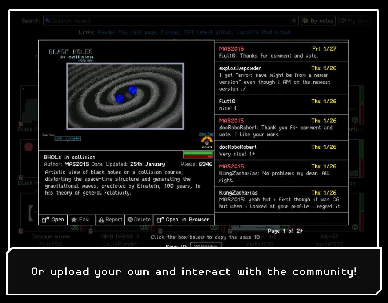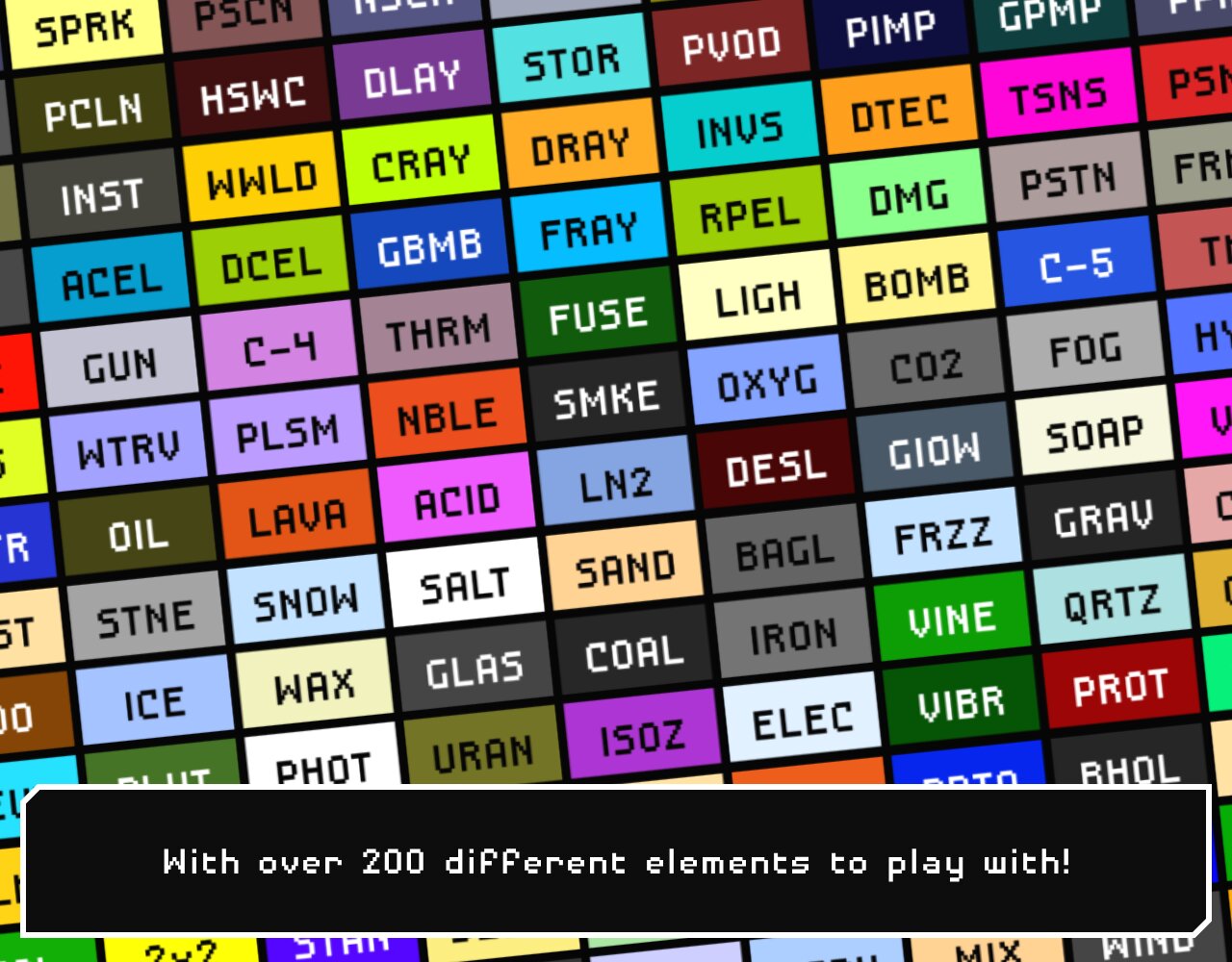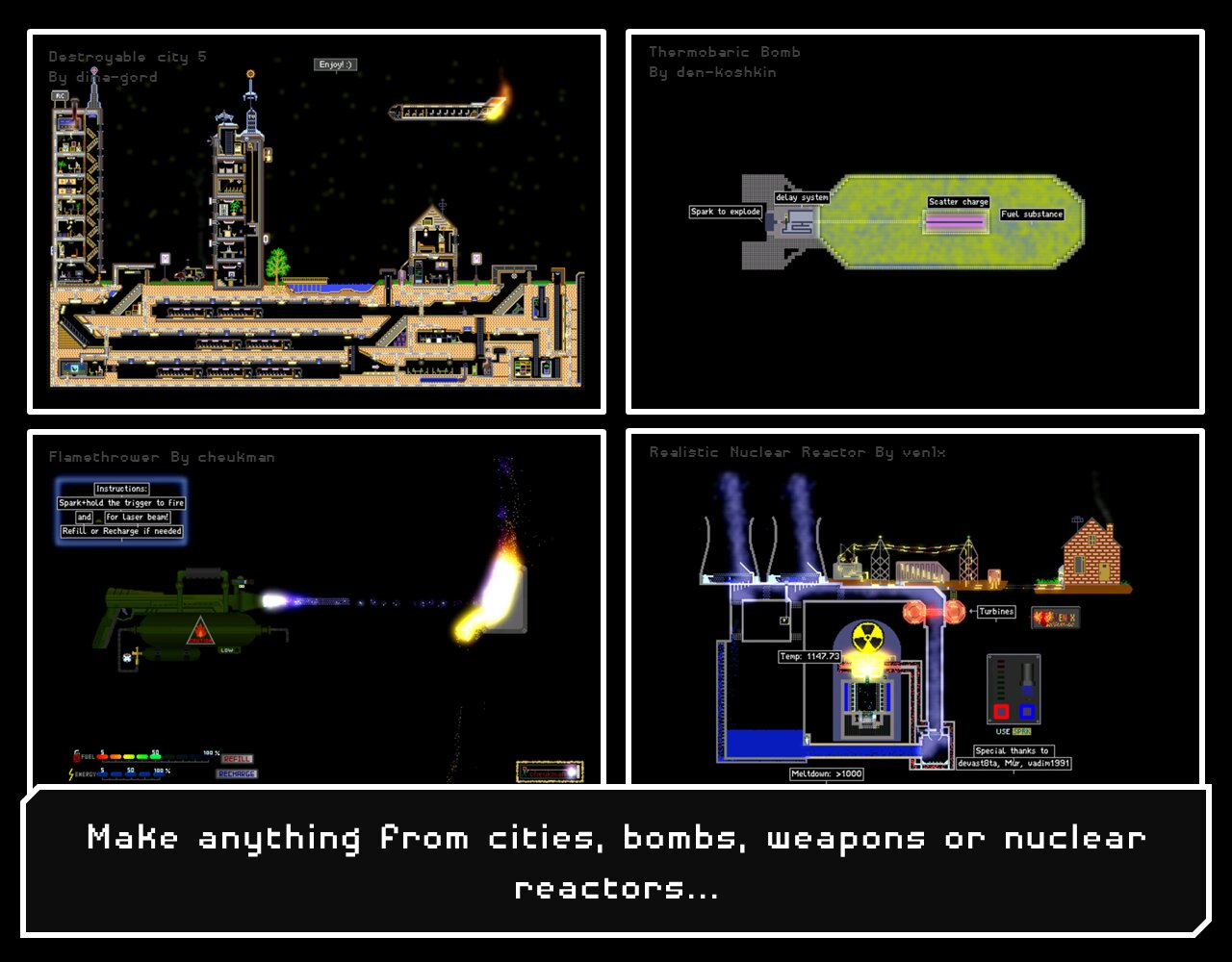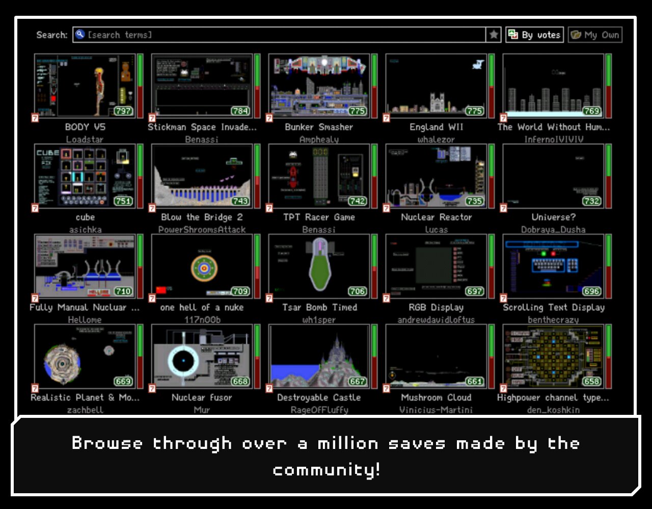 Powder Toy — это бесплатная игра-песочница с физикой, которая имитирует давление и скорость воздуха, тепло, гравитацию и бесчисленное количество взаимодействий между различными веществами! Игра предоставляет вам различные строительные материалы, жидкости, газы и электронные компоненты, которые можно использовать для создания сложных машин, пушек, бомб, реалистичных ландшафтов и почти всего остального. Затем вы можете их разрушить и посмотреть крутые взрывы, добавить сложную проводку, поиграть с маленькими человечками или управлять своей машиной. Вы можете просматривать и воспроизводить тысячи различных сохранений, созданных сообществом, или загружать свои собственные — мы приветствуем ваши творения!
