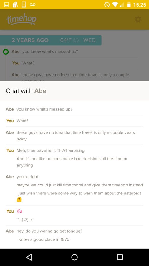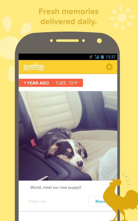 Timehop — это мобильное приложение, которое позволяет вам вспоминать и заново переживать прошлые воспоминания, отображая ваши сообщения в социальных сетях и фотографии за один и тот же день в предыдущие годы. Приложение извлекает контент из ваших подключенных аккаунтов, таких как Facebook*, Instagram*, Twitter и других. С помощью Timehop вы сможете легко оглянуться назад на самые дорогие для вас моменты и увидеть, насколько вы выросли со временем.