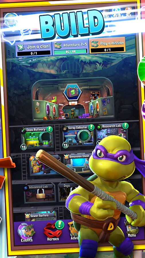 Возьмите в свои руки совершенствование базы черепах: добавляйте новые комнаты, улучшайте их, зарабатывайте важные ресурсы даже во сне! Сразитесь со знаменитыми злодеями Шреддером и Крангом, снарядите героев лучшим оружием, отточите их навыки боя и разблокируйте все эпические награды. Станьте самой крутой черепашкой-ниндзя прямо сейчас!
