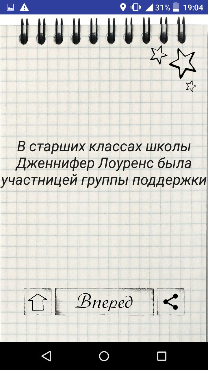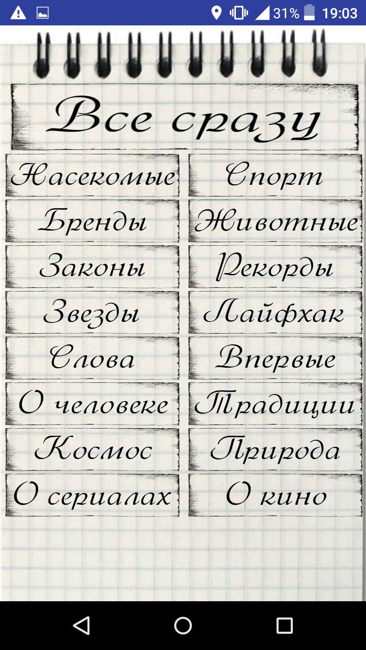 Разделы приложения — факты о животных, факты о брендах, факты о спорте, факты о насекомых, факты о рекордах, факты о законах, факты о знаменитостях, факты о лайфхаках, факты о словах, факты о человеке, факты о традициях, факты о первых в разных сферах, факты о природе, факты о космосе, факты о сериалах, факты о кино.