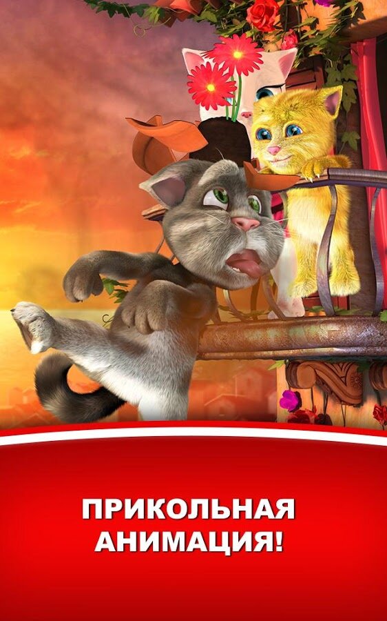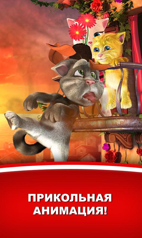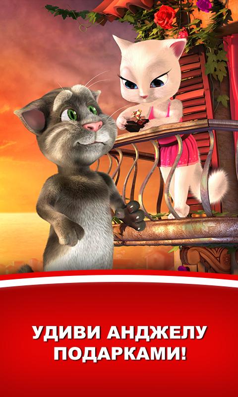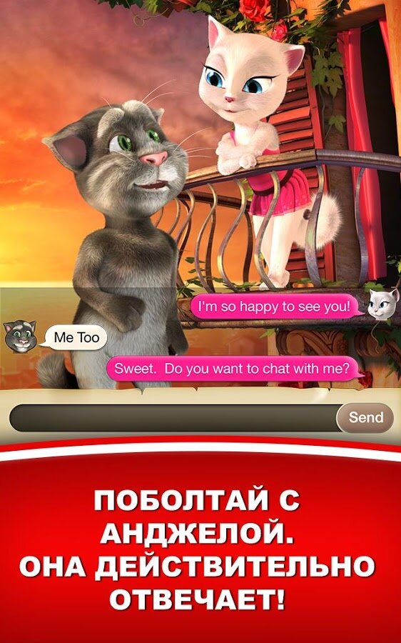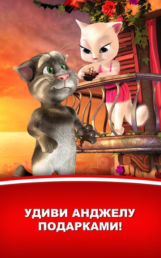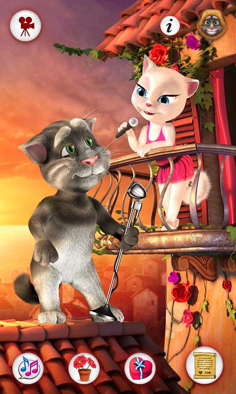Tom Loves Angela — забавное приложение на андроид. Говорящий Том возвращается, теперь он со своей возлюбленной Анджелой. Том вылез на крышу чтобы ухаживать за Анджелой, дарить ей подарки, распевать песни и разговаривать. Разговаривайте с Томом, и он передаст ваши слова Анджеле. Дарите ей подарки, подуйте в микрофон чтобы вызвать ветер, проведите пальцем по тому и он подарит воздушный поцелуй Анджеле, и пр. Скачайте и наслаждайтесь приложением!