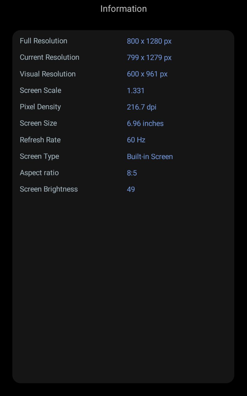 Приложение включает в себя три цветовых теста для оценки чистоты, градиентов и оттенков серого, а также два основных сенсорных теста. Тест на однократное касание помогает проверить чувствительность к прикосновениям по всей поверхности экрана, а тест на многократное касание подтверждает правильную работу жестов несколькими пальцами, обнаруживая до десяти одновременных точек касания. Вы можете мгновенно выйти из любого теста, дважды коснувшись экрана. На информационном экране отображаются ключевые характеристики дисплея, такие как разрешение экрана, плотность пикселей, соотношение сторон и текущий уровень яркости, что может быть полезно для настройки параметров с целью снижения нагрузки на глаза.