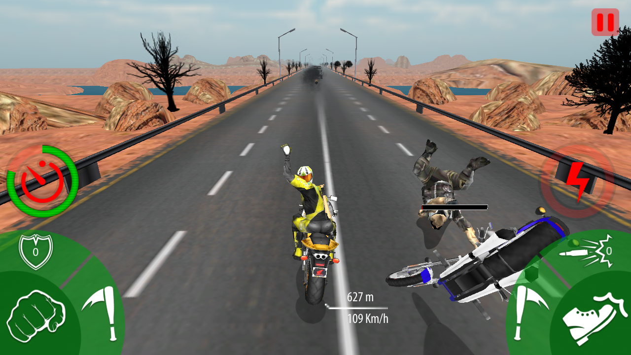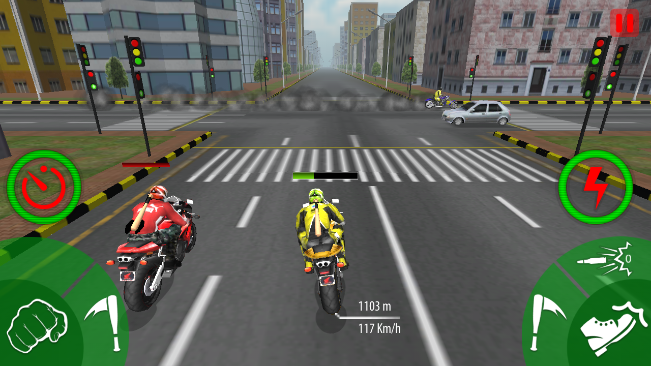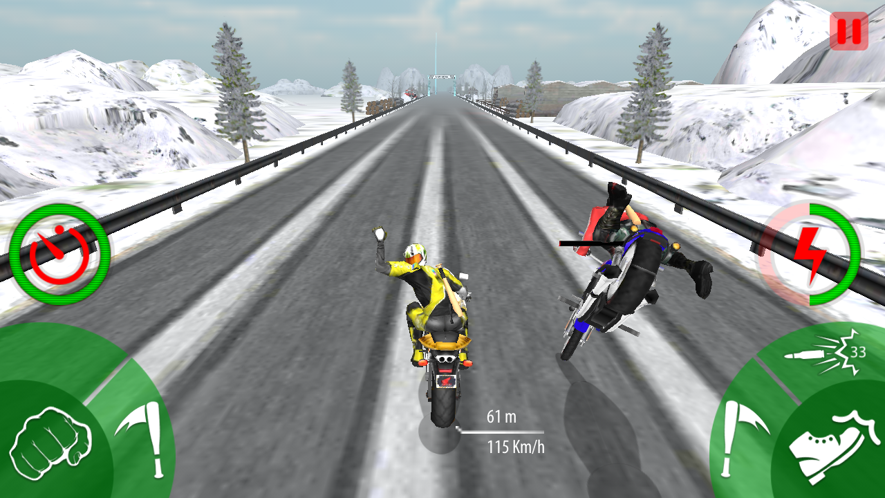 Traffic Moto Bike Attack Race — пользователь будет управлять мощным байком, несущимся по автомагистрали. В процессе заезда на пути игрока станут возникать разнообразные препятствия в виде другого автотранспорта, которые нужно объезжать. Также мешать поездке будут другие мотогонщики, способные сбросить водителя с байка. Со своей стороны геймеры также могут защищаться и атаковать соперников с помощью ударов руками, ногами, бейсбольной битой и даже выстрелами из огнестрельного оружия.