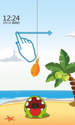 На экране разблокировки будет отображаться известный всеми герой из игры Cute The Rope. Для разблокировки экрана будет необходимо разрезать веревку, которая держит аппетитный кусочек мяса для зеленого монстрика.