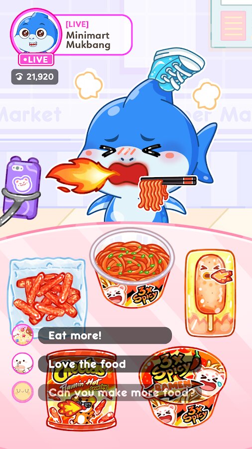Готовьте аппетитные блюда — от лапши до морепродуктов — и начните своё ASMR-шоу, где каждый хруст, чавканье и щелчок палочками станет контентом. Зрители любят шоу и звуки еды, а чем насыщеннее и страннее трансляция, тем выше вовлеченность! Трансляции приносят вам доход, который можно потратить на новые блюда, украшения для кухни и прокачку внешности стримера.
