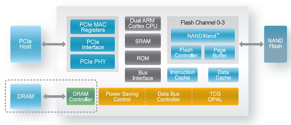 Представлен в конце 2017 года, поддерживает NVMe версии 1.3, интерфейс – PCI Express 3.0, 4 линии. Внутри два ARM ядра, возможно использование памяти DDR3 и DDR4 в качестве буфера. Модификация XT (установлена на испытуемом SSD) обходится без собственного буфера, используя вместо него оперативную память (технология HMB). Явный плюс такого решения один – удешевление производства и, соответственно, конечной цены продукта. Пиковые скорости передачи данных – 2400 на чтение и 1700 Мбайт/сек на запись. По всему видно, что контроллер создавался для производства недорогих моделей (по меркам NVMe накопителей) .