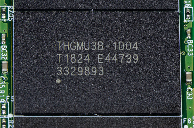 NAND память объемом 512 гигабайт набрана восемью микросхемами THGMU3B-1D04, доступный пользователю объем – 477 гигабайт.