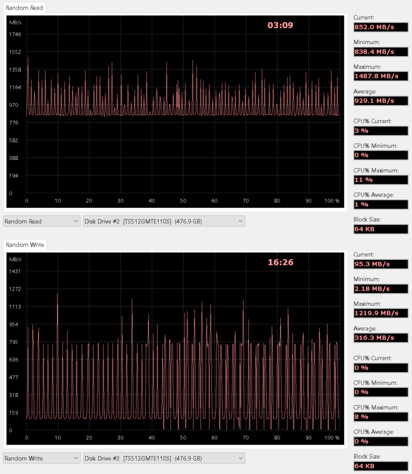 Немаловажный момент при работе более-менее скоростных моделей (к которым TS512GMTE110S относится) – нагрев контроллера. Два замера – с простым алюминиевым радиатором-пластиной и без него – показывают важность использования теплоотвода.