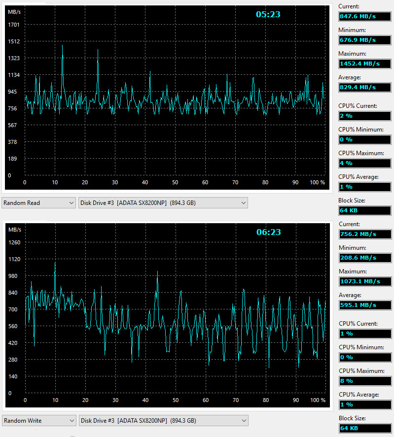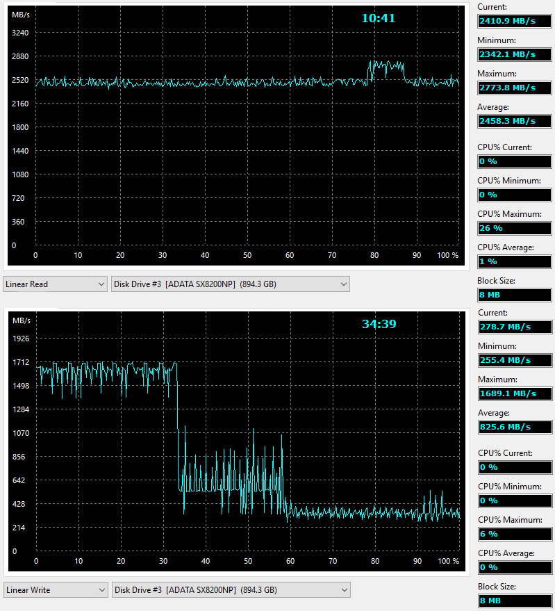 Графики последовательного чтения и записи из тестового пакета AIDA показывают, что накопитель отлично справляется с операциями чтения, но малый объем псевдо-SLC буфера портит общую картину.