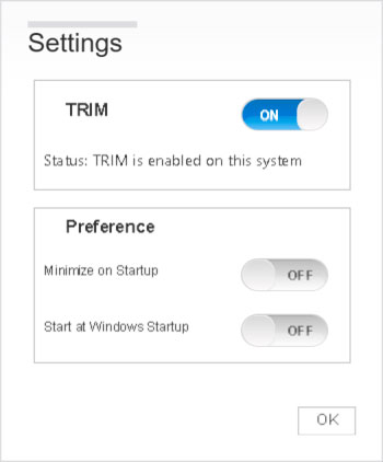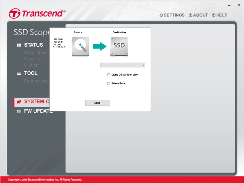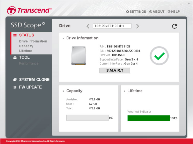 Контролировать состояние накопителя можно фирменной утилитой SSD Scope. Кроме индикации параметров «здоровья» (заполнение диска, ресурс ячеек, информация SMART), есть быстрый скоростной тест, опция переноса системного раздела с HDD на SSD и возможность обновления прошивки.