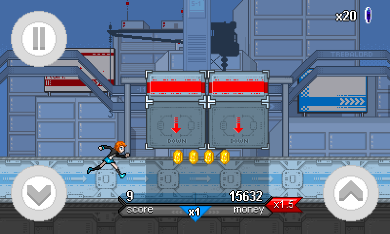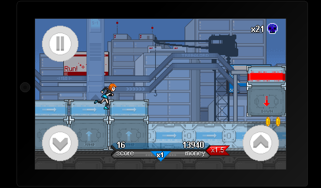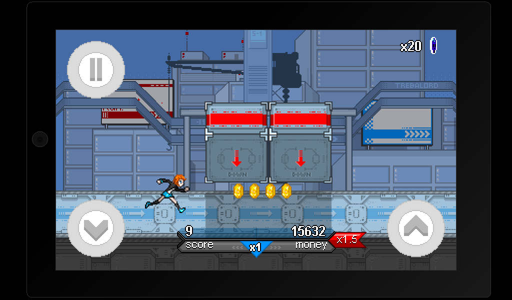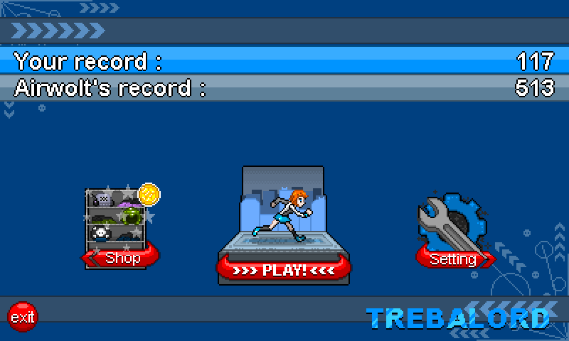 Trebalord — раннер на андроид, в котором вы будете бегать по различным мирам Евой — рыжеволосой девушкой. Бегайте, прыгайте, избегайте препятствия и собирайте монетки, на которые сможете купить различные костюмы для своей героини и улучшить ее. Попробуйте побить рекорд разработчика по очкам и за это вы получите особый приз. Вас ждет пиксельная графика с возможностью смены вида города на заднем плане.