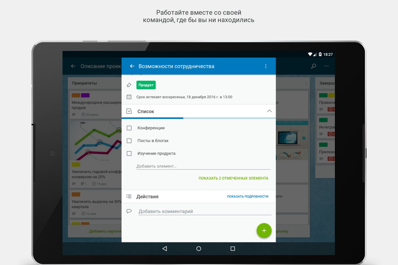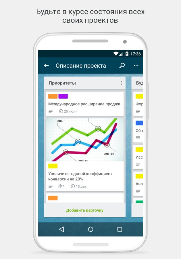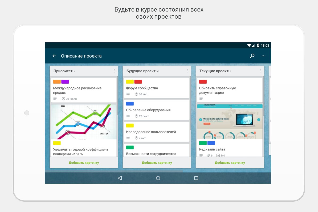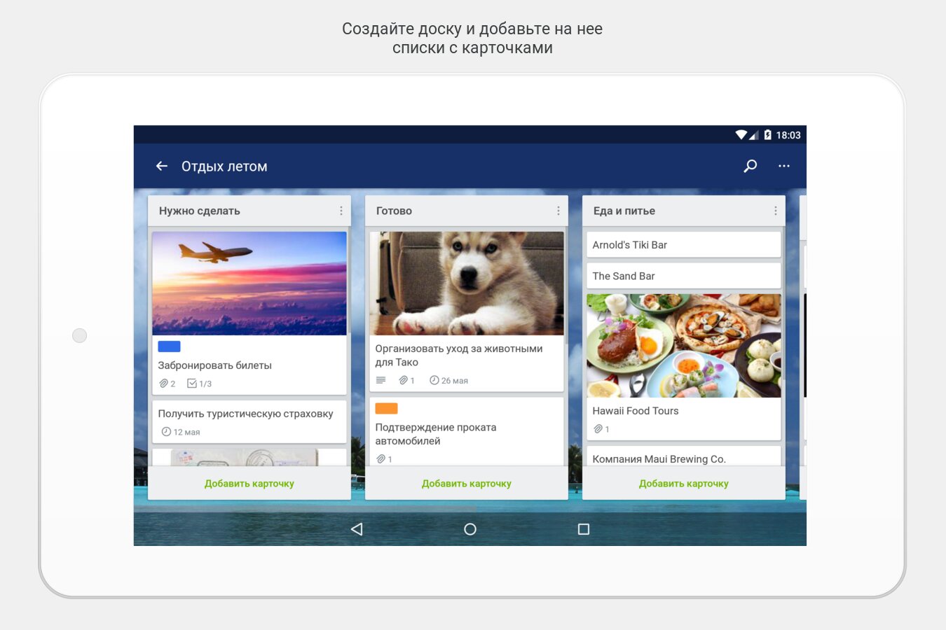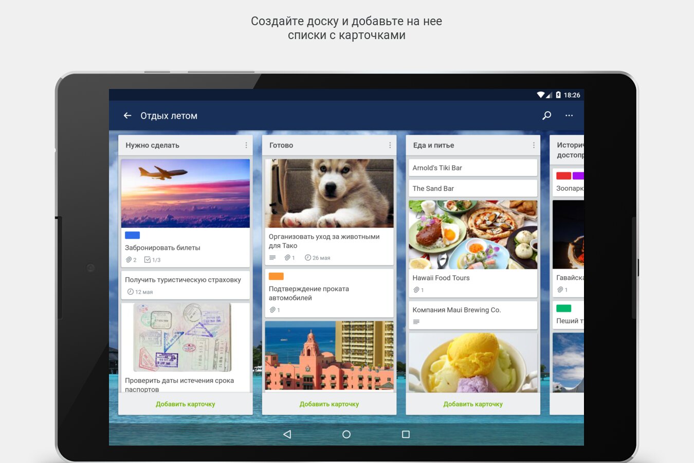 Trello — прост в использовании и бесконечно гибок в настройке. Вы будете точно знать, что нужно делать, кто собирается это сделать, и что будет в следующий раз. Кроме того, все, что вы запланировали можно синхронизировать и отправлять мгновенно в облако, так что все ваши устройства всегда будут в актуальном состоянии.