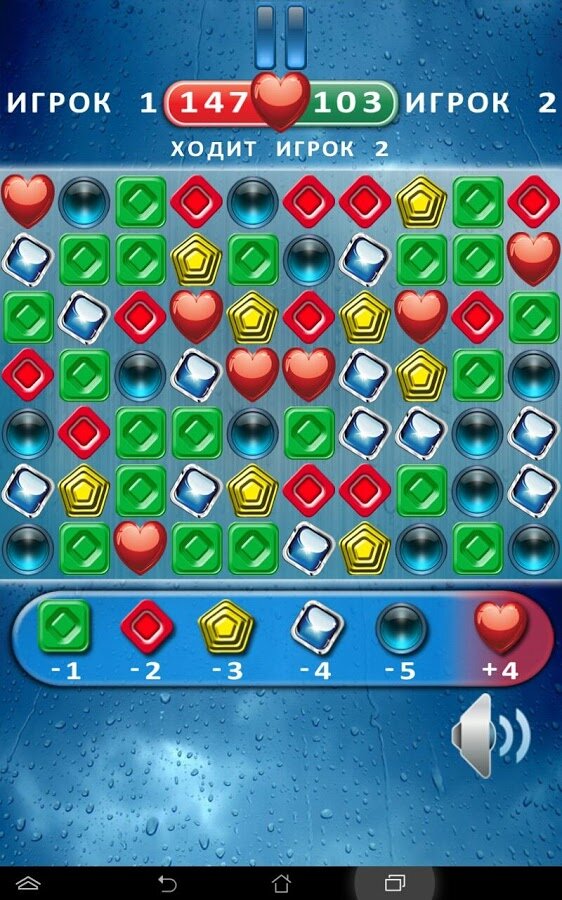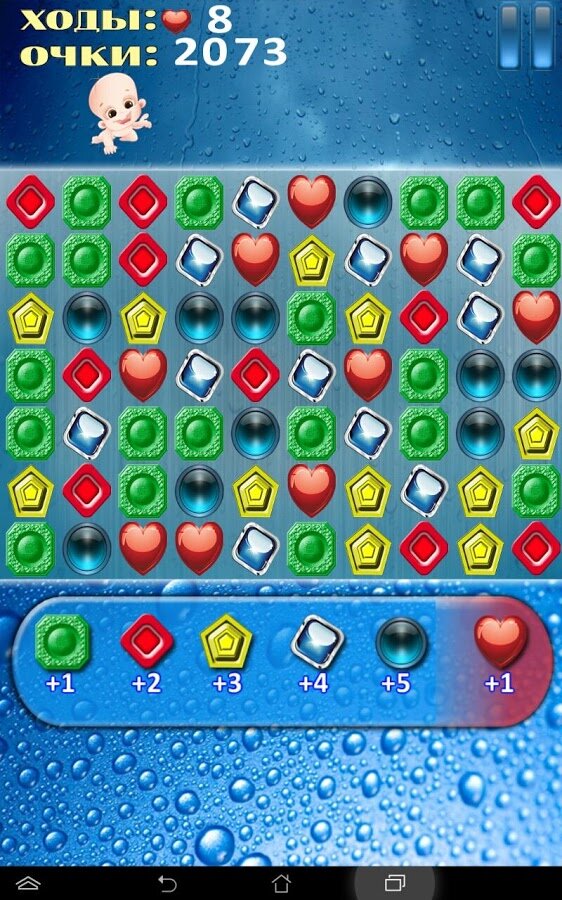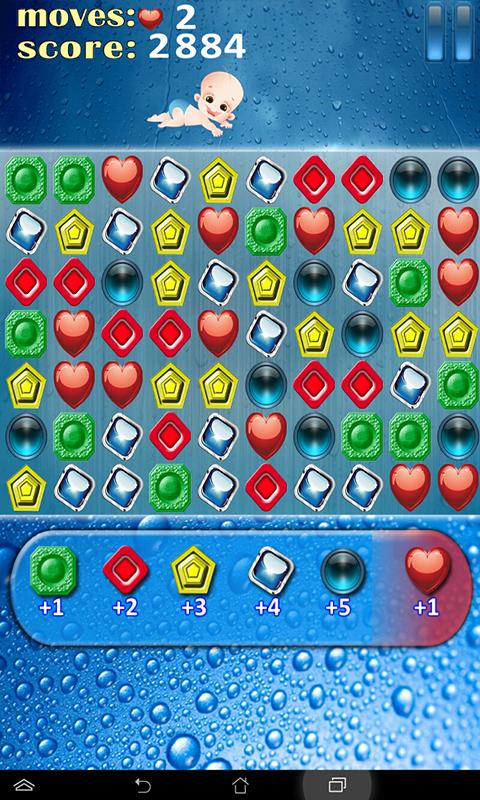Вам надо собирать три или больше одинаковых фигур, при этом, их можно убирать, как горизонтально, так и вертикально. Двигать фигуры, необходимо, движением пальца. Для этого, фигуры перемещаются в различных направлениях, как направо, так и налево, а, так же, как вверх, так и вниз.