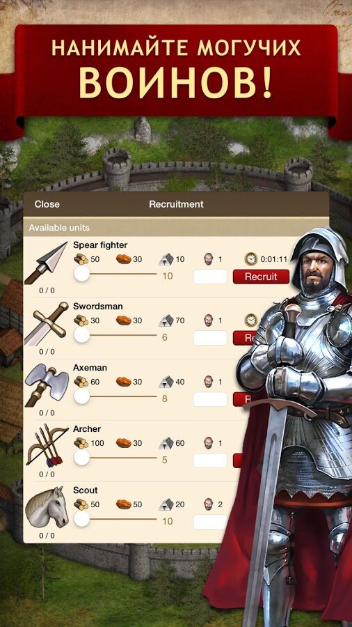 - Создайте могущественную армию, нанимая различные атакующие и защитные войска