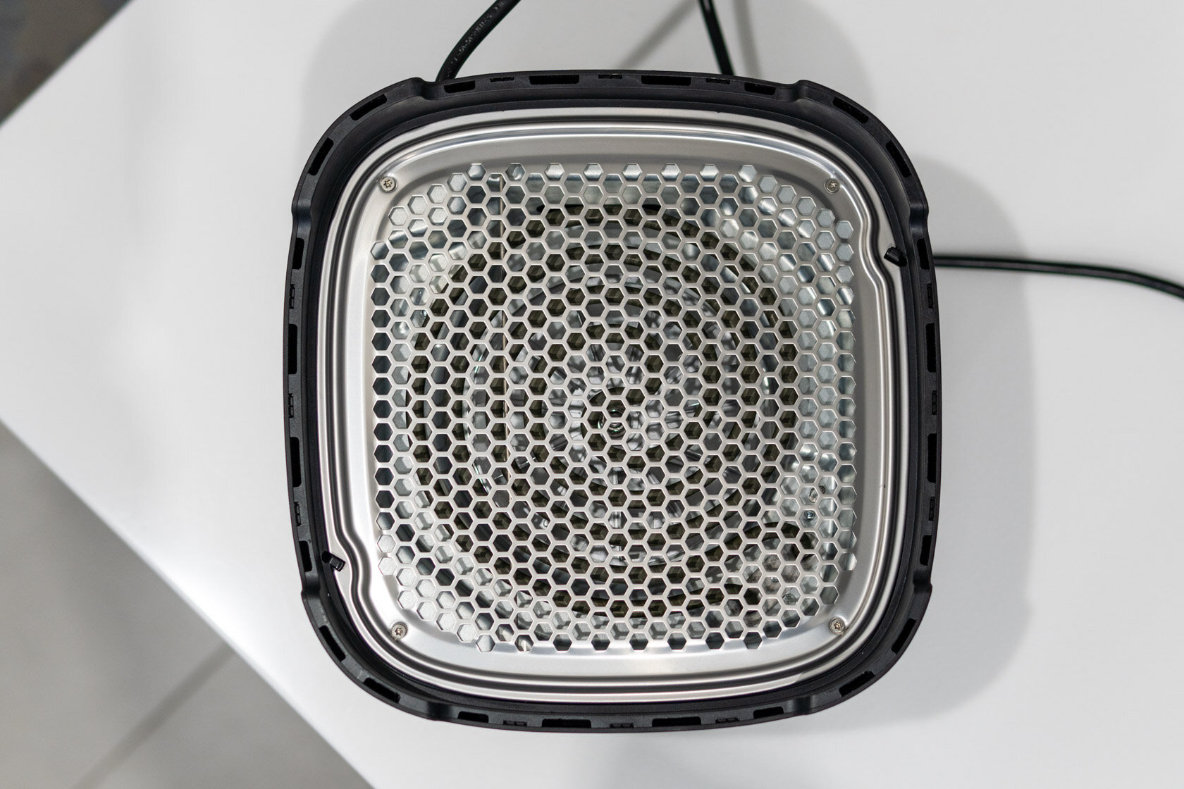 Между краем корпуса и защитной решеткой есть зазор в пару сантиметров, поэтому основной блок можно без опаски ставить на любую жаростойкую поверхность. Я использовал стеклокерамическую поверхность плиты.