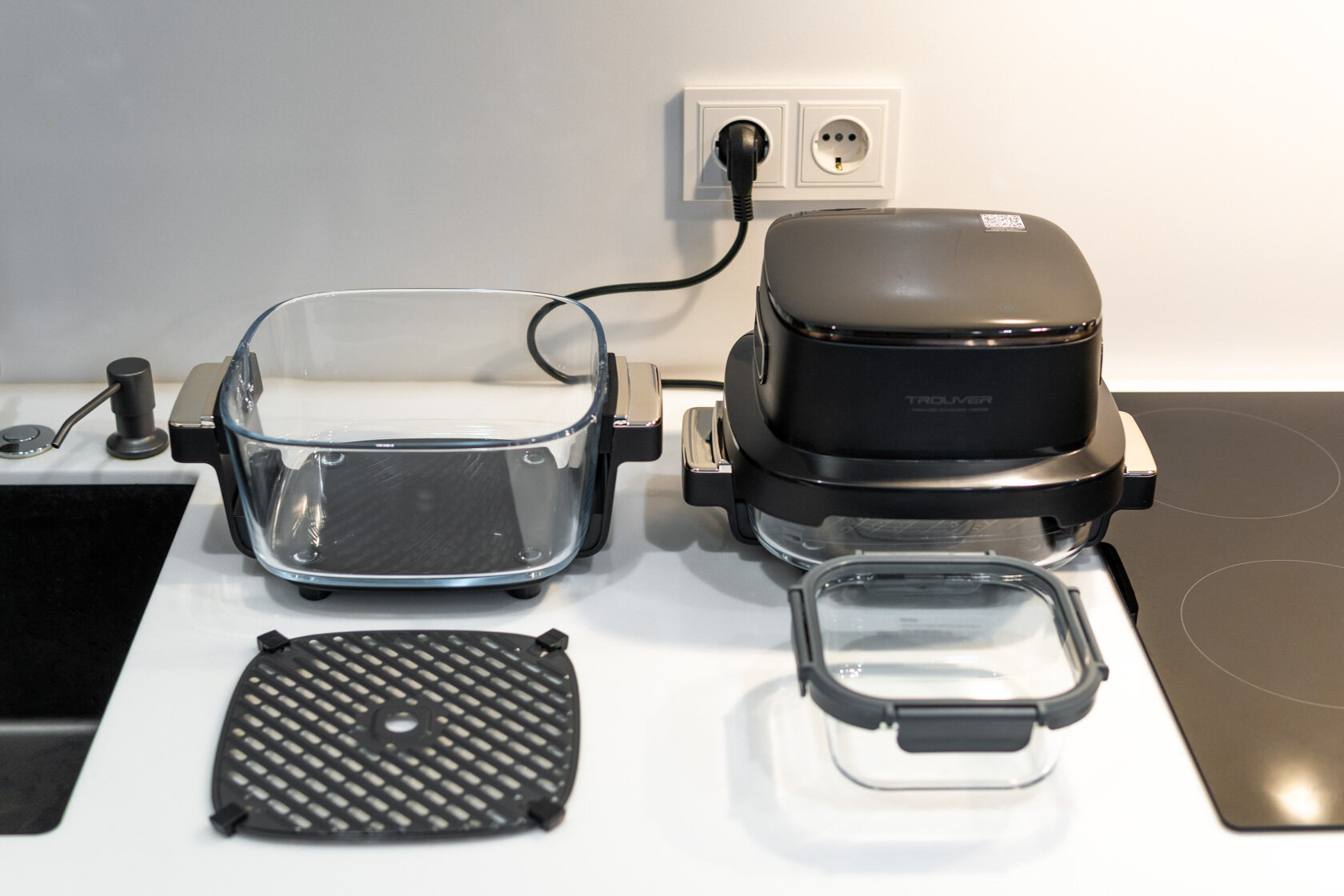 У Trouver AF20 Pro неожиданно богатый комплект, продиктованный особенностями конструкции. Помимо основного модуля, в него входят две стеклянные ёмкости для готовки, большая (4 литра) и малая (2,5 литра). Две гриль-решетки с антипригарным покрытием для каждой чаши. Приятным сюрпризом стал небольшой стеклянный контейнер для хранения еды.