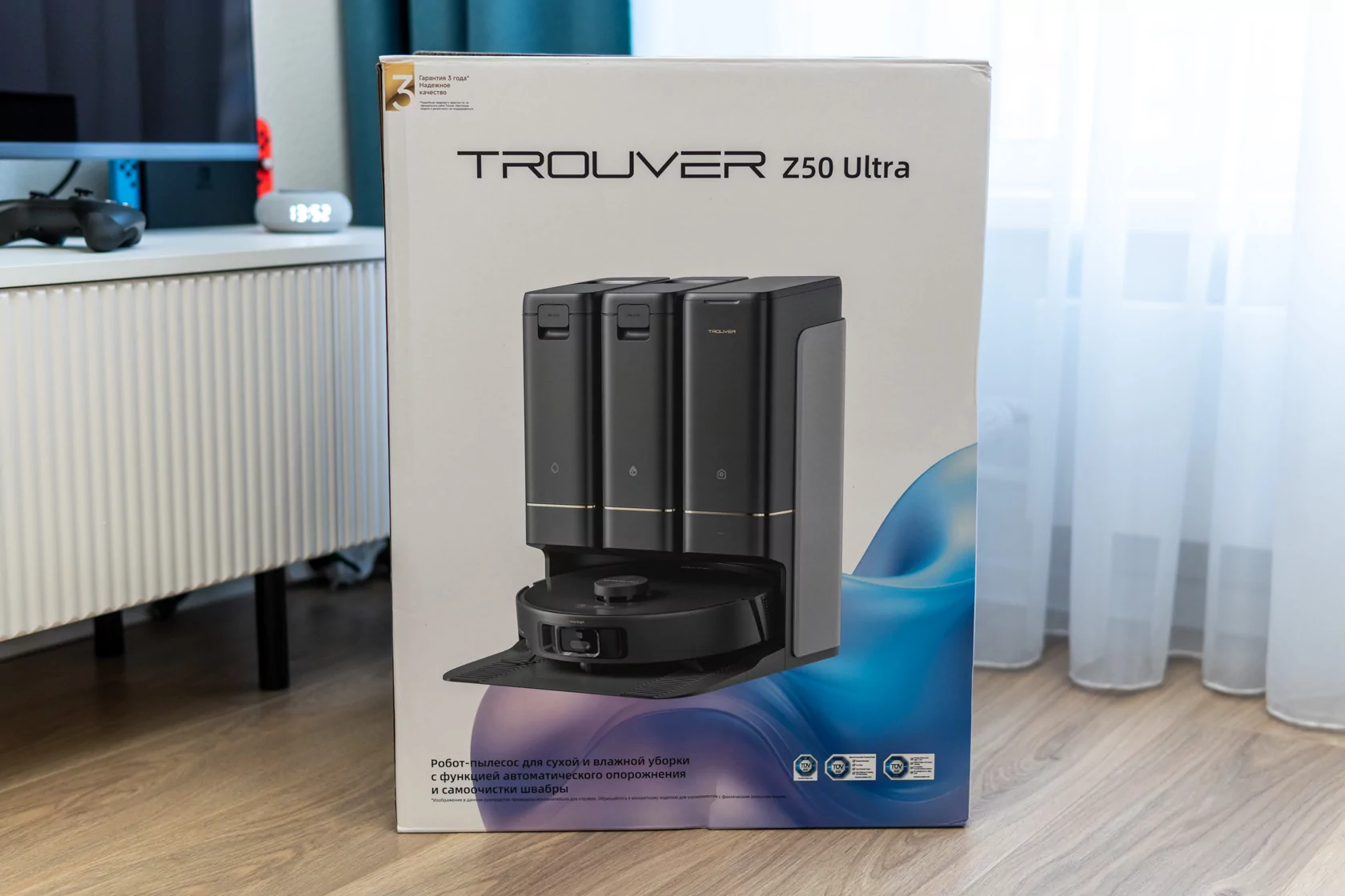 Как и большинство других роботов-пылесосов с умной базовой станцией, Trouver Z50 Ultra поставляется в довольно крупной коробке с цветной полиграфией — выглядит весьма солидно, есть ощущение, что над упаковкой постарались.