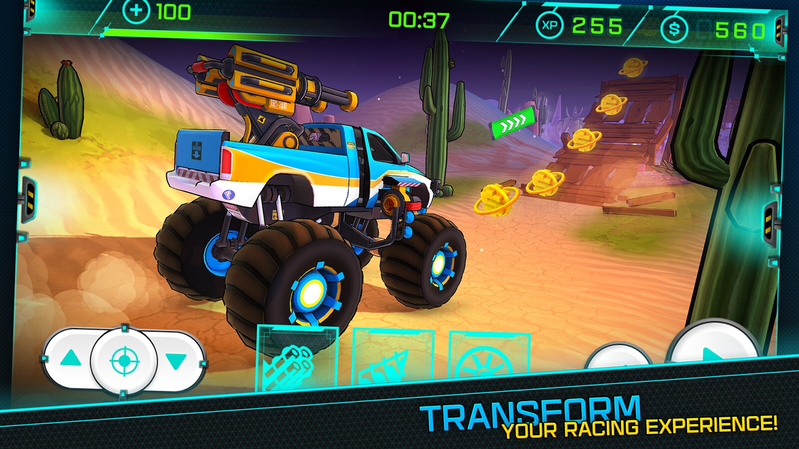 У всех из четырех форм грузовика есть доступные усовершенствования, которые позволят улучшить характеристики. Улучшенные колеса увеличат ускорение и максимальную скорость твоего грузовика, а более мощные пушки позволят быстрее уничтожать препятствия. Улучшение всех форм грузовика поможет тебе пройти уровни вовремя.Гоняй, трансформируйся, стреляй, летай и пробивай свой путь через все 60 уровней игры — пора играть в Trucksform!