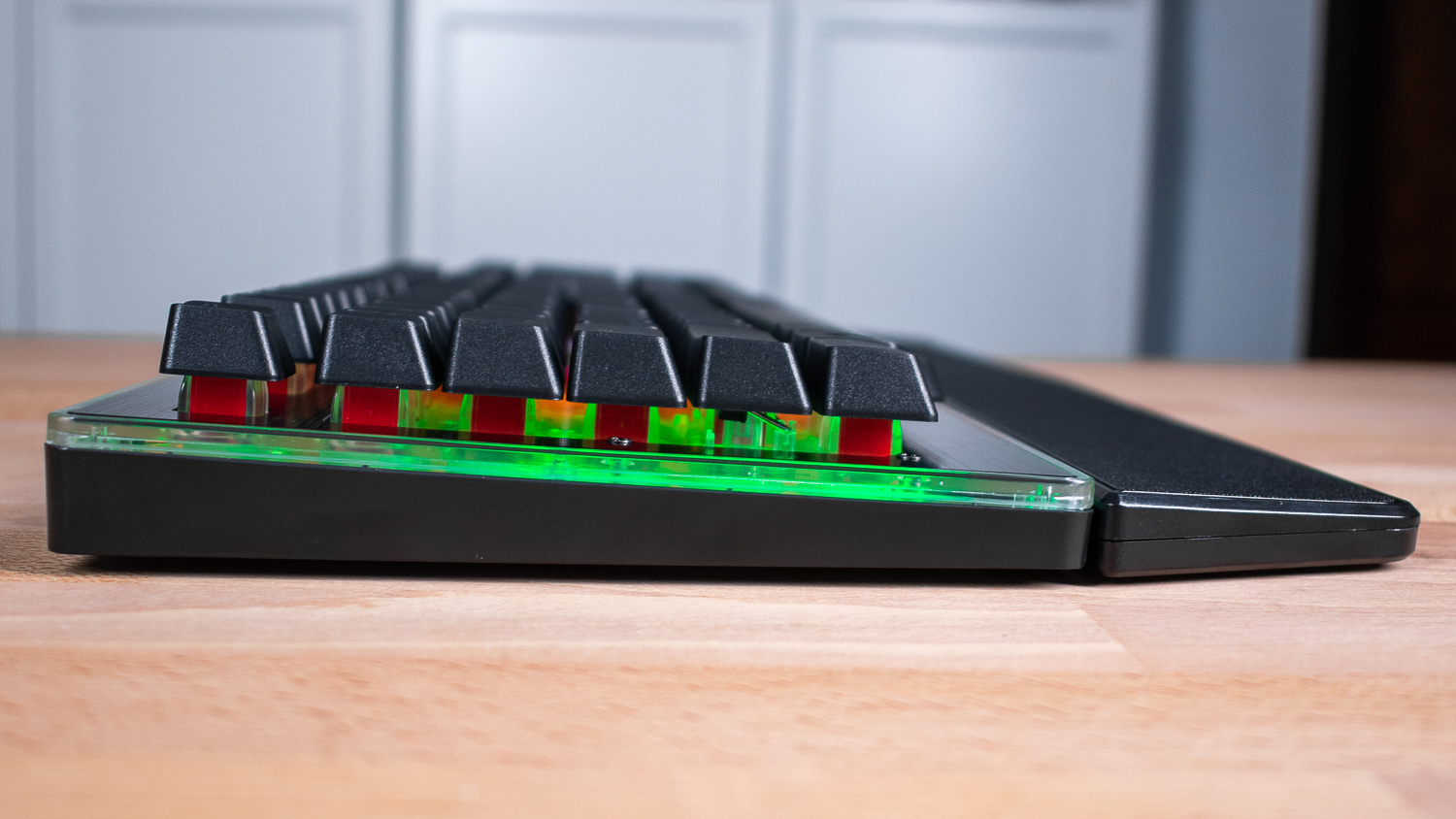 На первый взгляд новинку действительно не отличить от механической клавиатуры: массивный корпус, высокие клавиши со съёмными колпачками. Необычный формат выдаёт нехарактерная подсветка, застилающая всю поверхность, включая промежутки между клавишами. Фронтальная панель украшена шлифованным металлом и светящимся обрамлением. Сборка радует монолитностью, благодаря раме из хорошего пластика.
