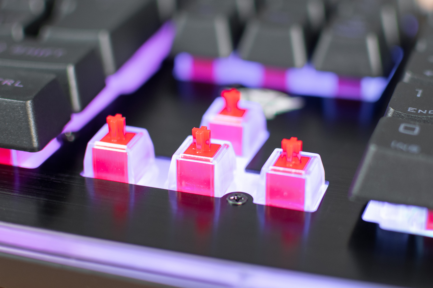 Под колпачками клавиш находятся толкатели, точно такие же, как в механических клавиатурах. Но принцип действия кардинально отличается: под толкателем находится не пружинный механизм, а обычная мембрана. Таким образом, клавиши полумеханической клавиатуры выглядят, как механические, а на деле представляют из себя чуткую мембрану с хорошей обратной связью. Ход клавиш не превышает 4 мм, момент срабатывания находится в последней трети.