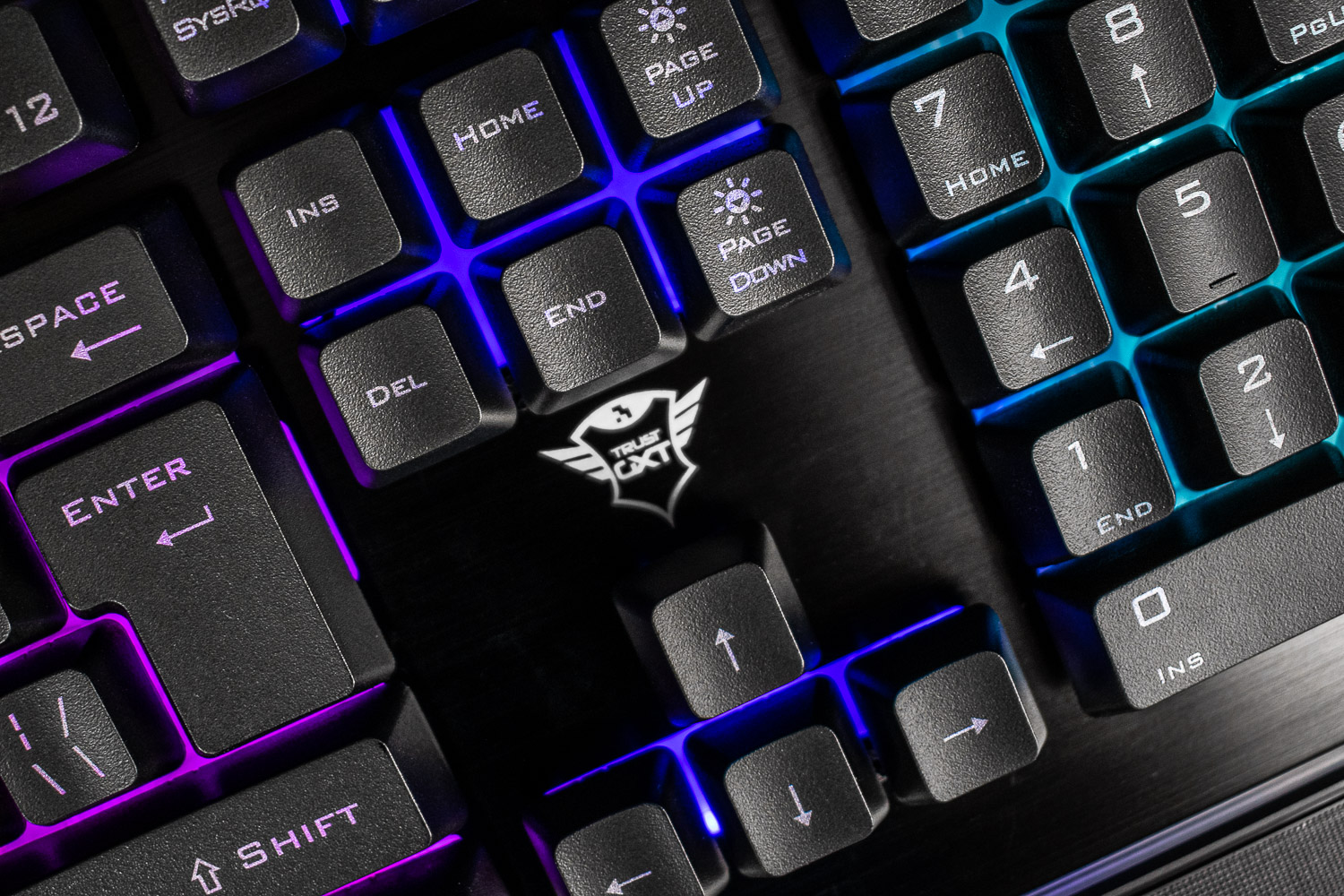 Если у механических клавиатур светодиоды подсвечивают индивидуально каждую клавишу, то у Trust GXT 860 Thura светится вся мембранная подкладка. Такой подход обеспечивает равномерное свечение всех клавиш и пространства между ними. Однако символы на некоторых колпачках выгравированы некачественно и просвечиваются не полностью.