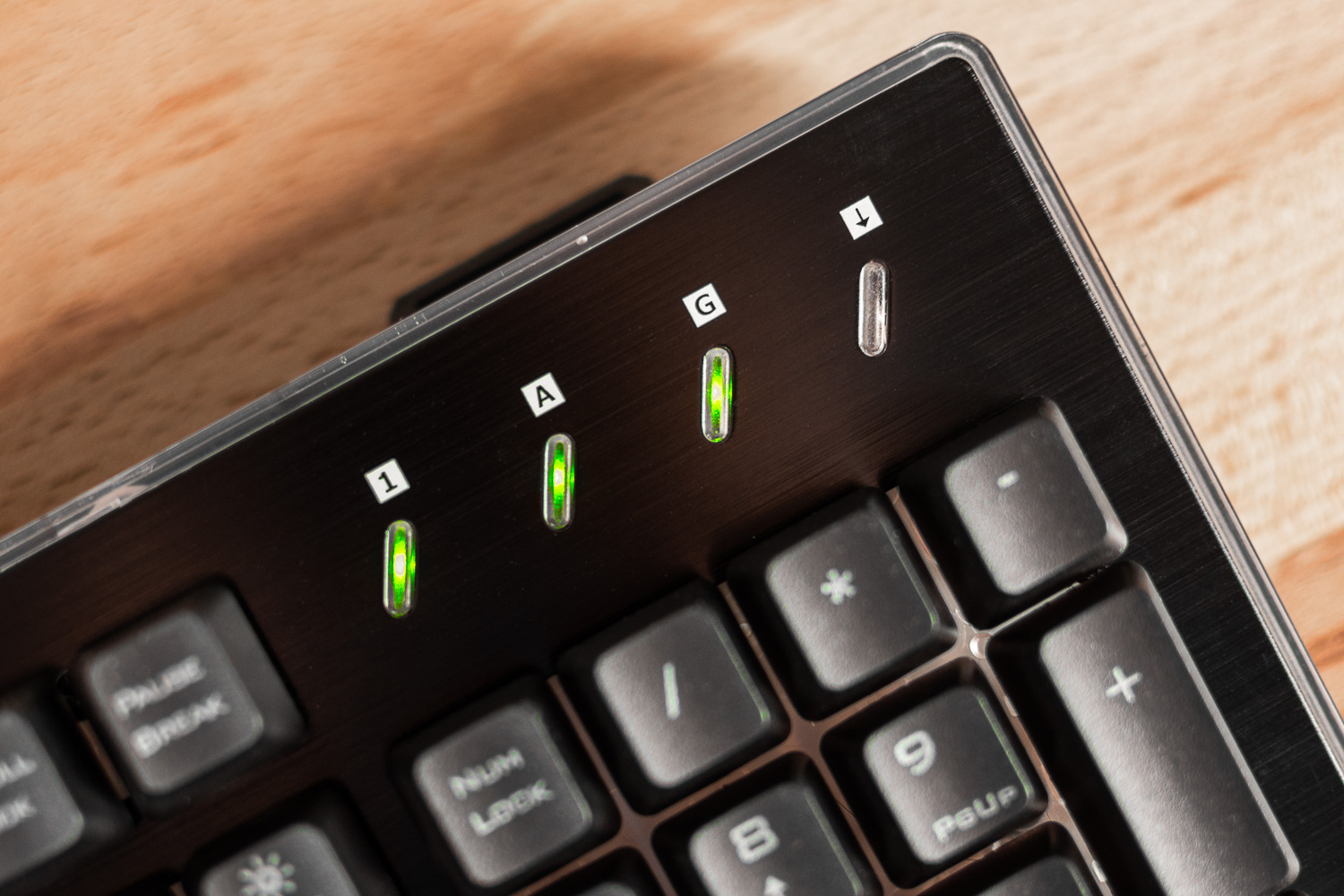 Стандартный набор их трёх индикаторов дополнен лампочкой геймерского режима.