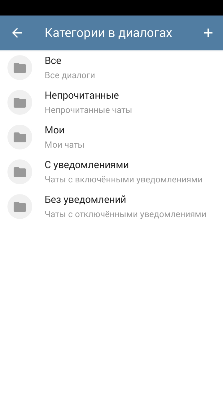 - разделение переписки на категории (чаты, каналы, группы, боты);