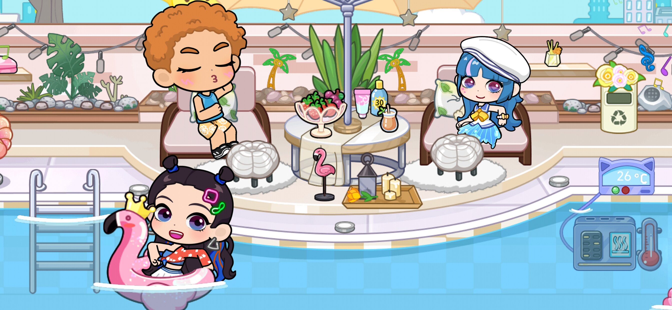Создавайте памятные моменты в фотостудии, организуйте вечеринки в тематической комнате или даже исследуйте космос – мир игры наполнен активностями на любой вкус. Регулярные обновления добавляют новые локации и мероприятия, делая игру ещё увлекательнее.