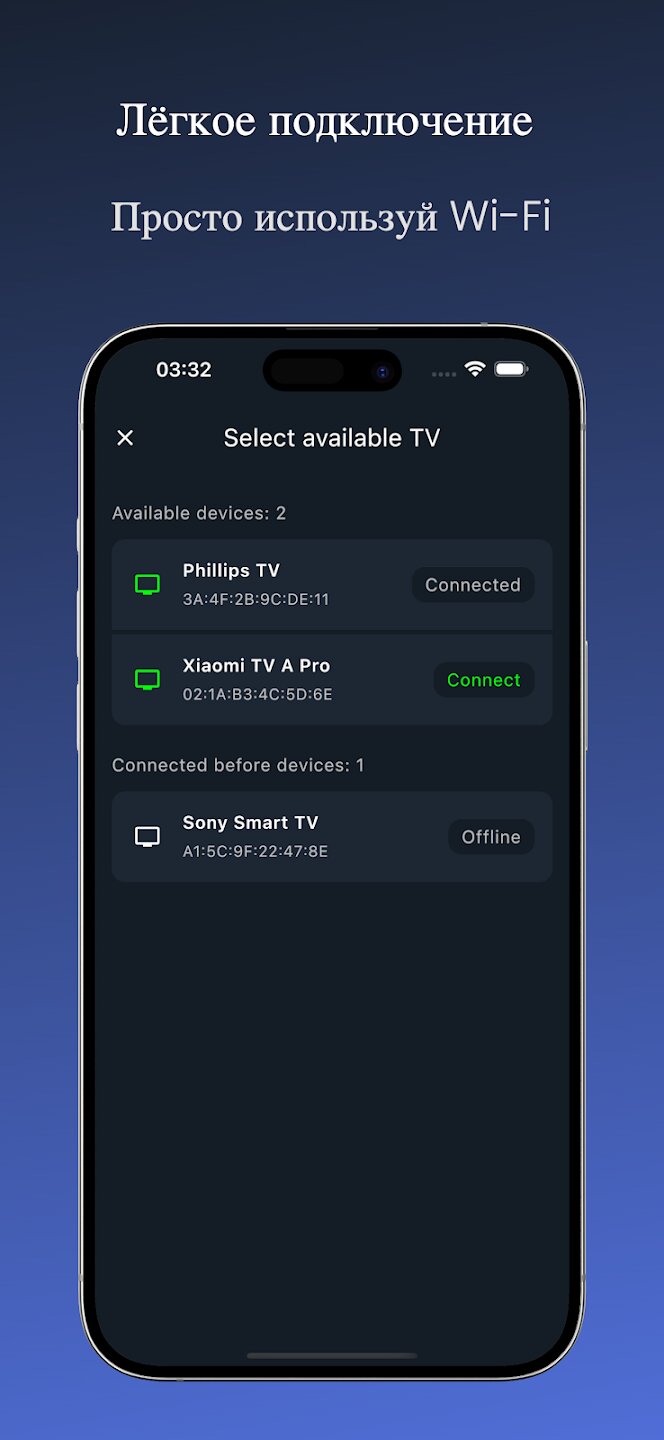 - Автоматическое обнаружение телевизора через Wi-Fi (без кодов сопряжения)