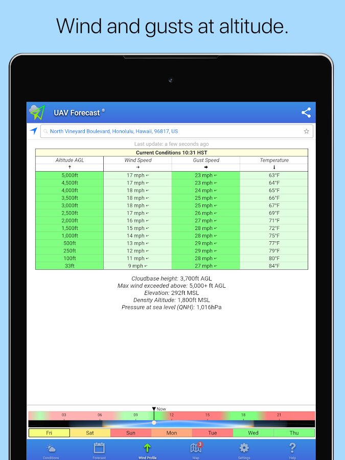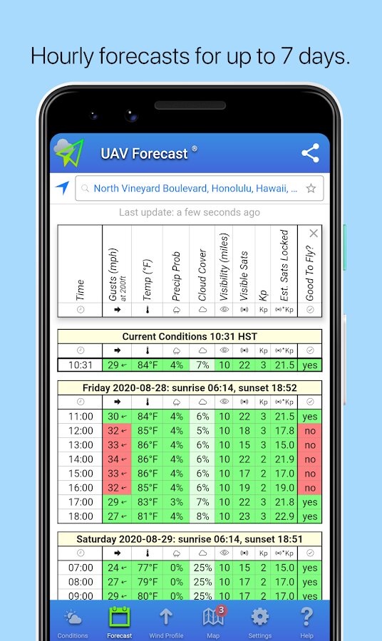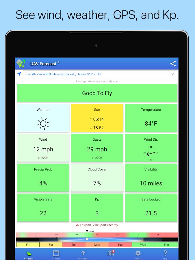 UAV Forecast for Drone Pilots – смотрите прогноз погоды, спутники GPS, солнечную активность (Kp), бесполетные зоны и ограничения на полеты, все в одном удобном инструменте. Идеально подходит для дронов DJI Spark, Mavic, Phantom, Inspire, 3DR Solo, Parrot Bebop и многих других беспилотных летательных аппаратов и систем.