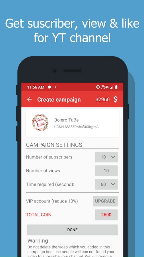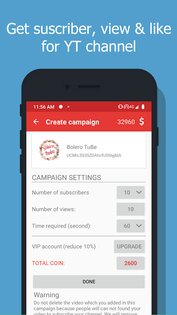 Благодаря этому приложению вы сможете развить ваш YouTube канал. Вы можете получить бесплатно подписчиков, просмотры и лайки на ваши видео. Для того, чтобы начать раскрутку вашего канала или видео, вам нужно просмотреть, подписаться или поставить лайк на видео других пользователей, за эти действия вы получите монеты. Монеты нужны для того, чтобы заказывать рекламу вашего канала или видео среди других пользователей.