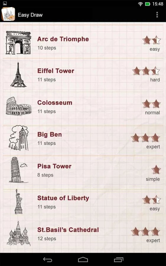 Рисование принято считать очень сложным занятием. Вы ни за что не поверите насколько легко рисовать с помощью грамотно составленных пошаговых инструкций не проверив это лично. Приложение Рисуем: Самые интересные Чудеса Света подходит для самообучения, для развития детей, для учителей рисования и это просто способ весело провести время вместе с семьей или друзьями! Приложение Рисуем: Лучшие Строения Мира содержит большую коллекцию пошаговых инструкций на любую тему. Вы обязательно найдете то, что Вы действительно хотите!