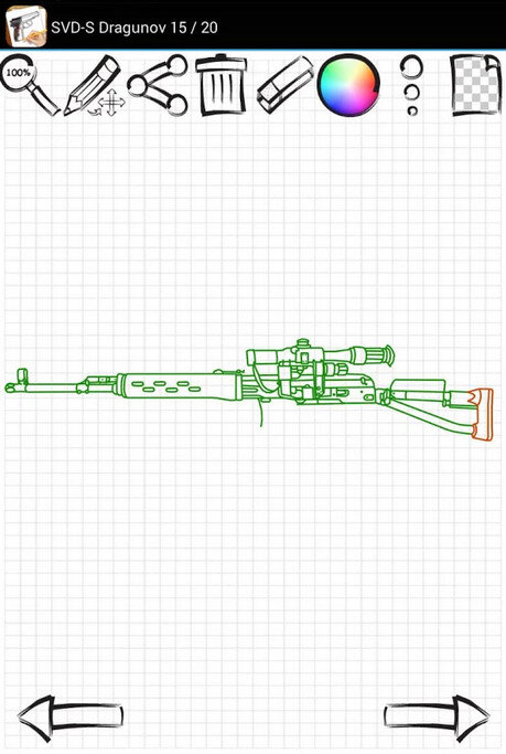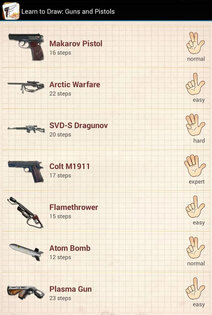 Рисование принято считать очень сложным занятием. Вы ни за что не поверите насколько легко рисовать с помощью грамотно составленных пошаговых инструкций не проверив это лично. Приложение Рисуем: Боевые Пистолеты и Автоматы подходит для самообучения, для развития детей, для учителей рисования и это просто способ весело провести время вместе с семьей или друзьями! Приложение Рисуем: Военное Оружие содержит большую коллекцию пошаговых инструкций на любую тему. Вы обязательно найдете то, что Вы действительно хотите!