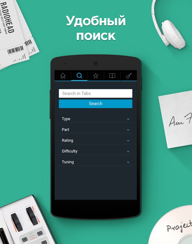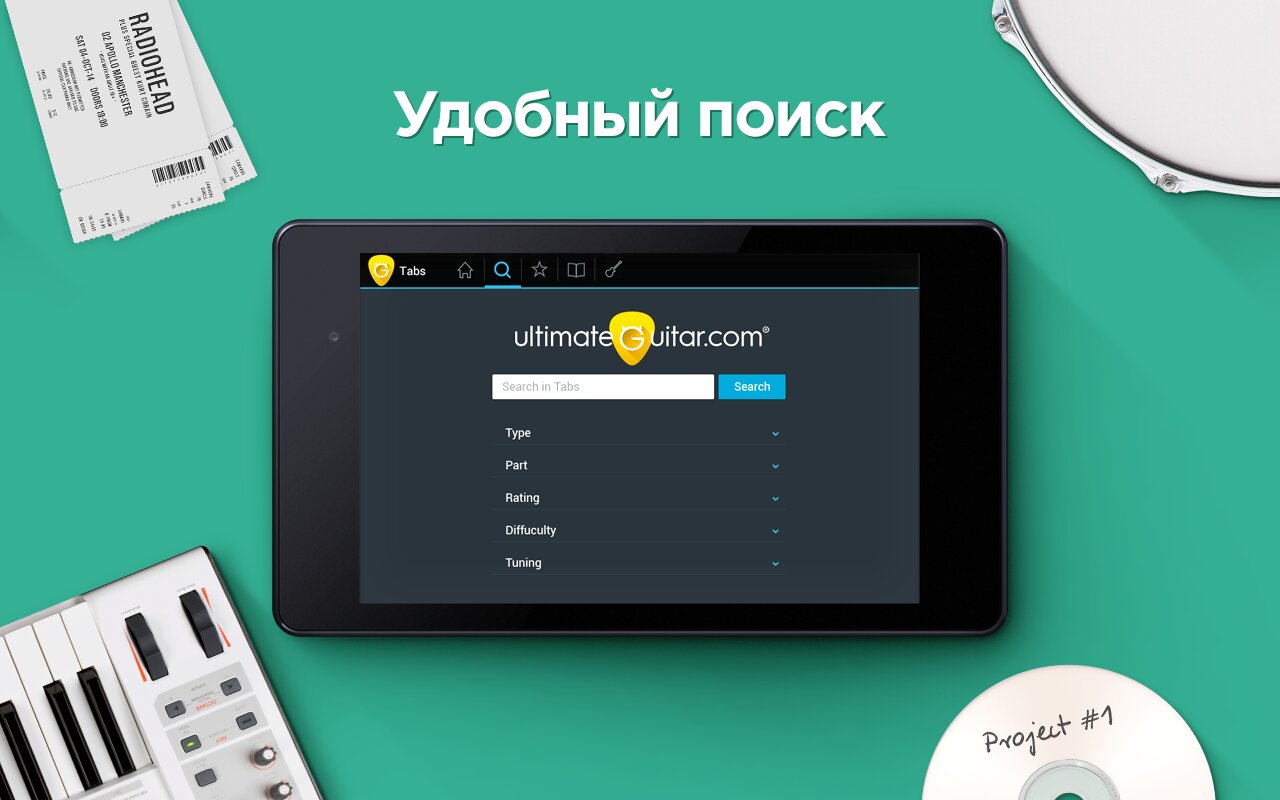 - Удобный поиск. Быстро и легко ищите нужные табы по имени исполнителя или названию песни.