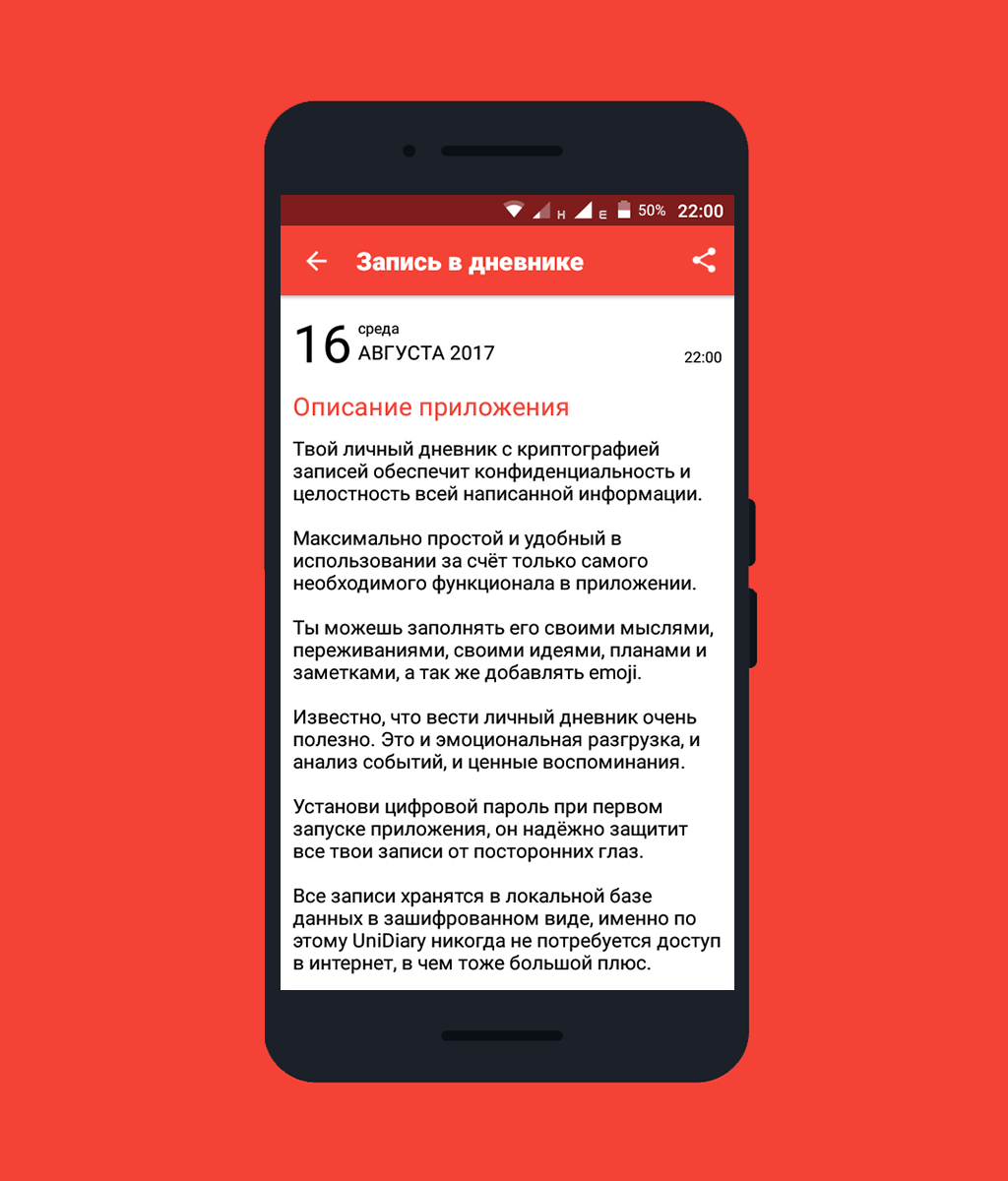 - Все записи хранятся в локальной базе данных в зашифрованном виде, именно по этому UniDiary никогда не потребуется доступ в интернет, в чем тоже большой плюс.