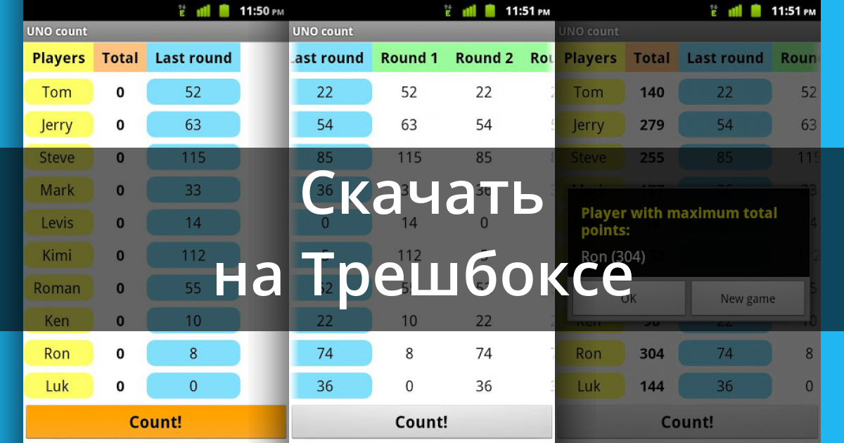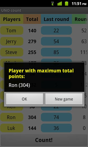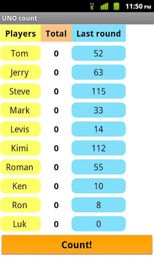 UNO count — разработана чтобы помочь Вам посчитать очки во время карточной игры UNO. Просто введите очки, набранные за последний раунд, каждым из игроков и нажмите кнопку «Посчитать!» — «UNO count» сделает всё остальное.