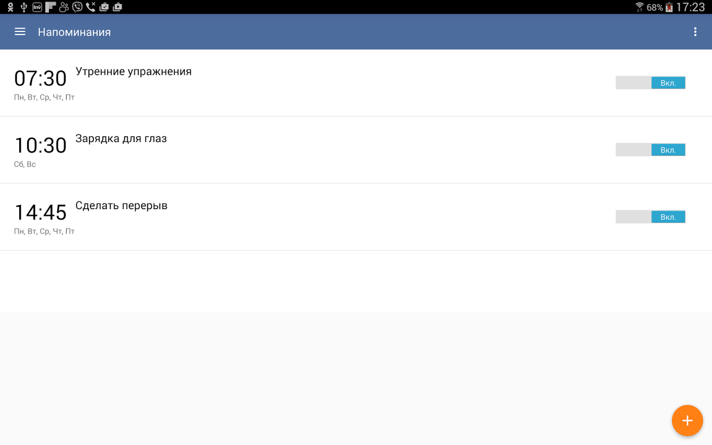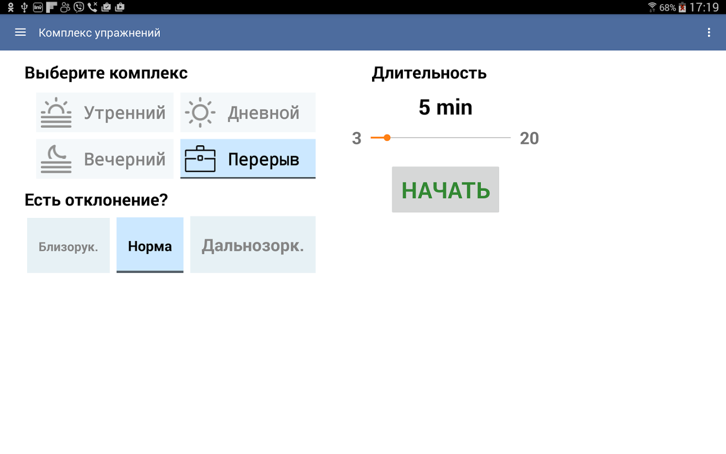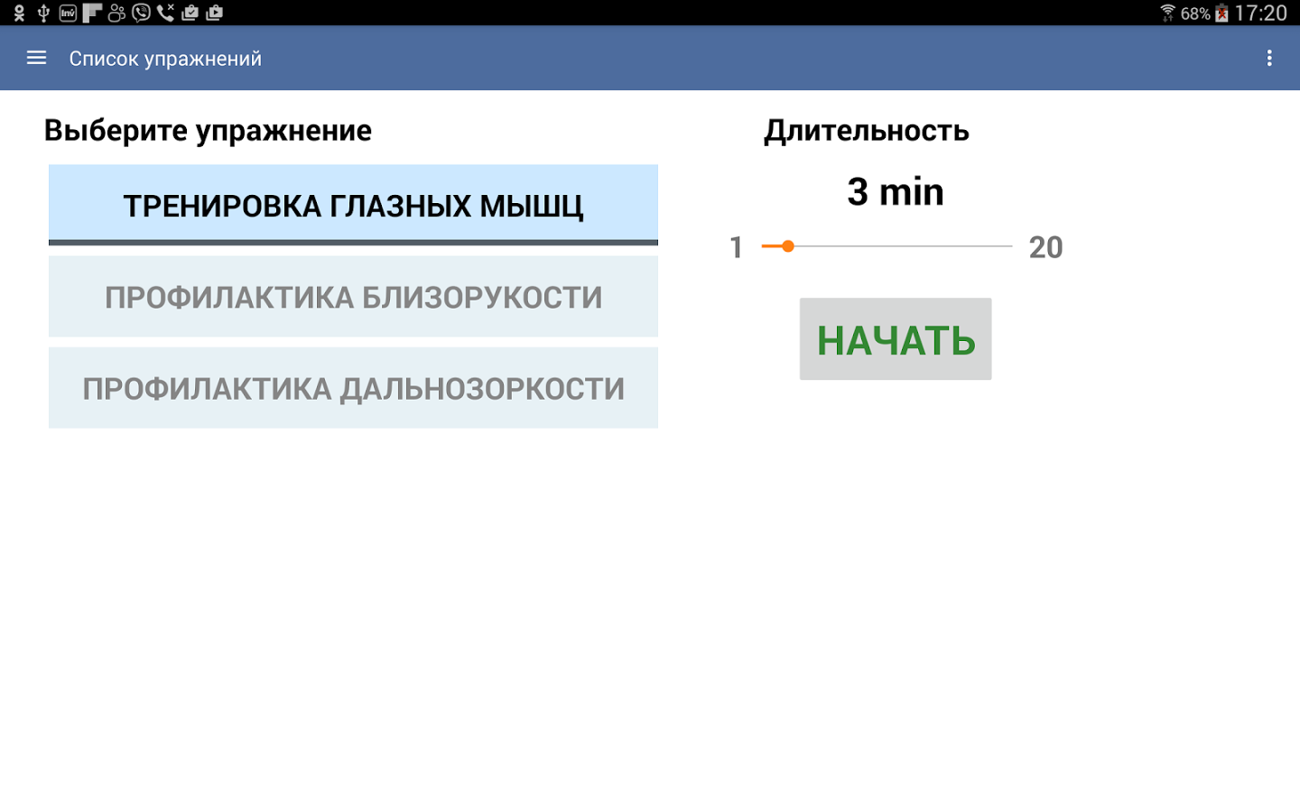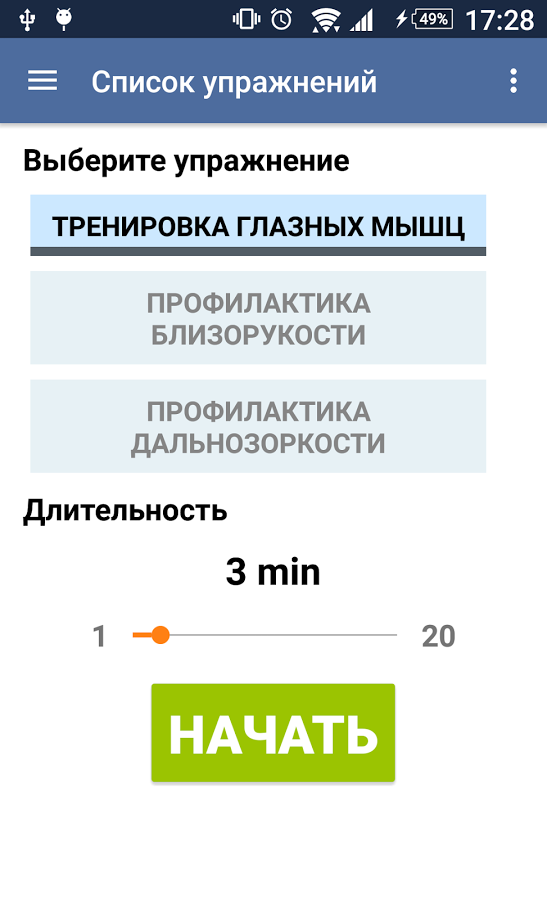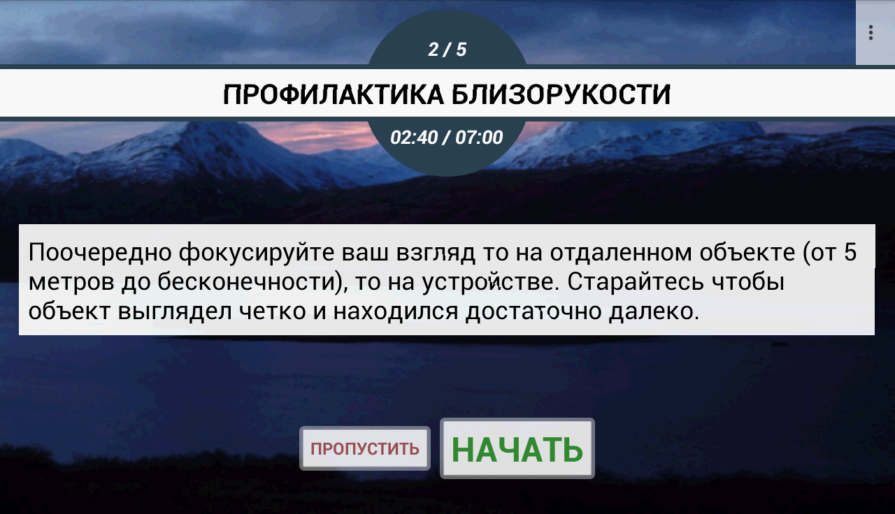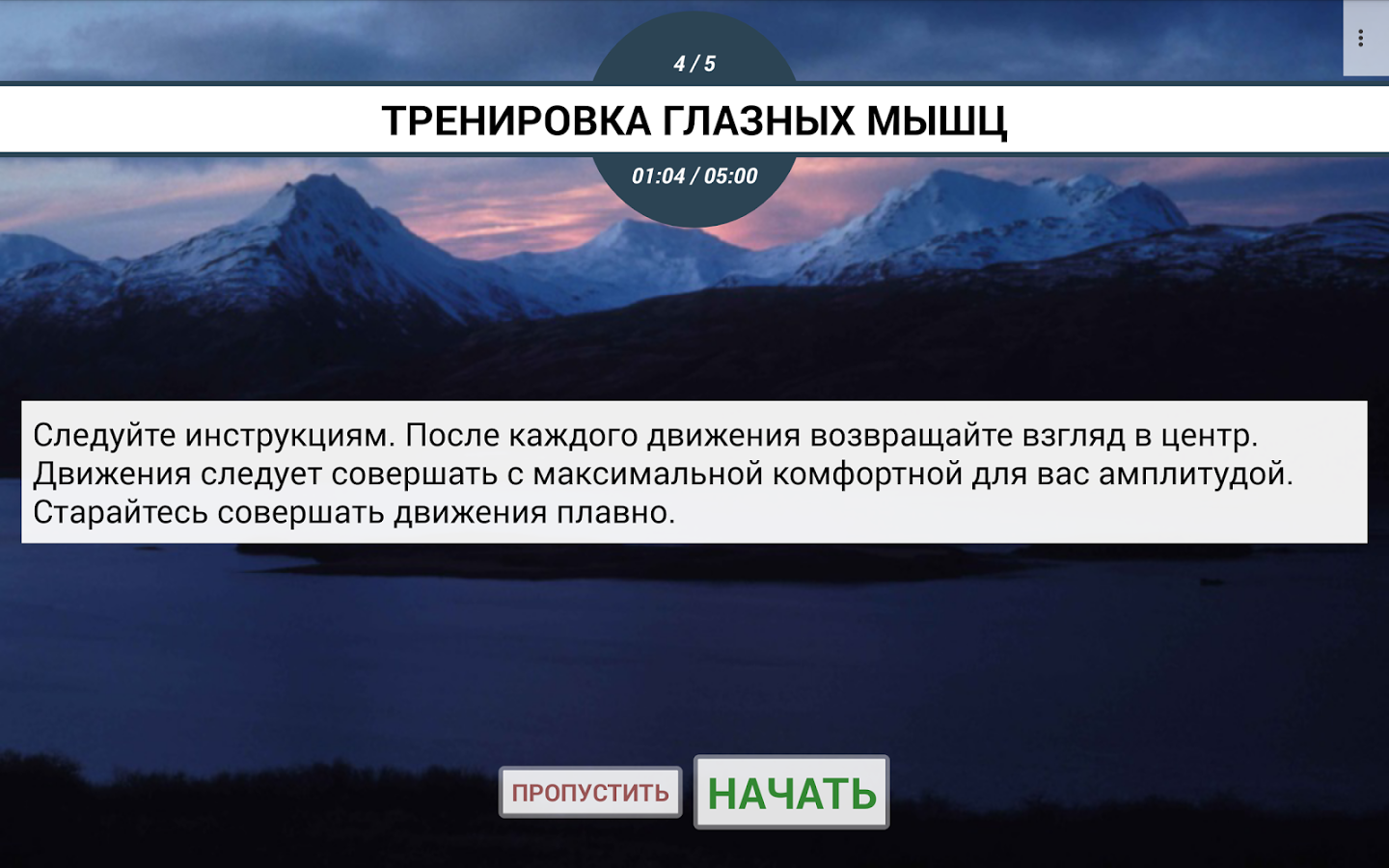 Упражнения для глаз — для того чтобы улучшить зрение и не потерять его из-за ослабления глазных мышц начните регулярно выполнять упражнения для глаз. Это приложение содержит комплекс упражнений для улучшения зрения. Для достижения успеха в коррекции зрения при помощи гимнастики для глаз нужно заниматься регулярно и правильно. Приложение поможет вам делать упражнения для глаз регулярно и в удобное для вас время. Создайте будильник и начинайте день с зарядки для глаз. Создайте напоминания и делайте гимнастику для глаз во время перерывов в работе за компьютером. Все в ваших руках!