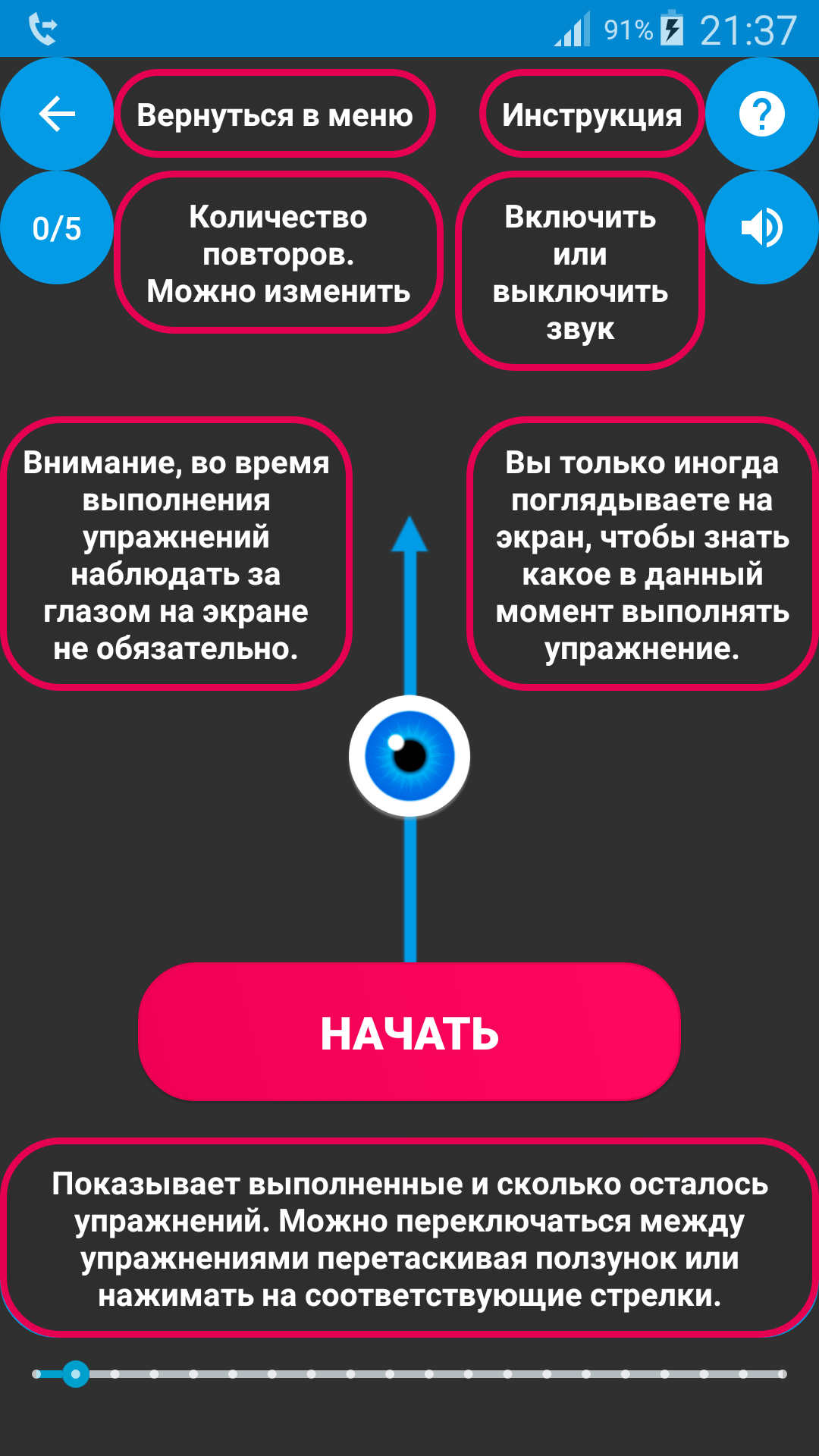 Вы можете сами настраивать количество повторов каждого упражнения, также в приложение -Упражнения для глаз для удобства встроен синтезатор речи, который проговаривает каждое упражнение для восстановление зрения и количество повторов.