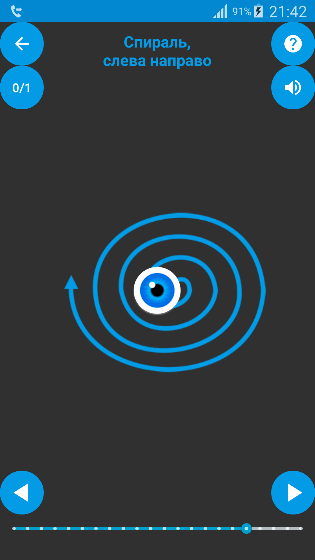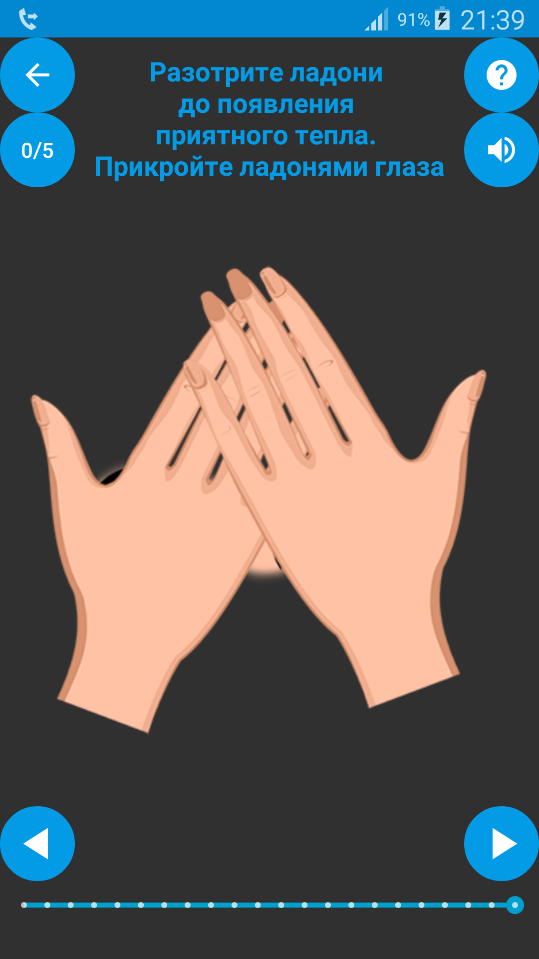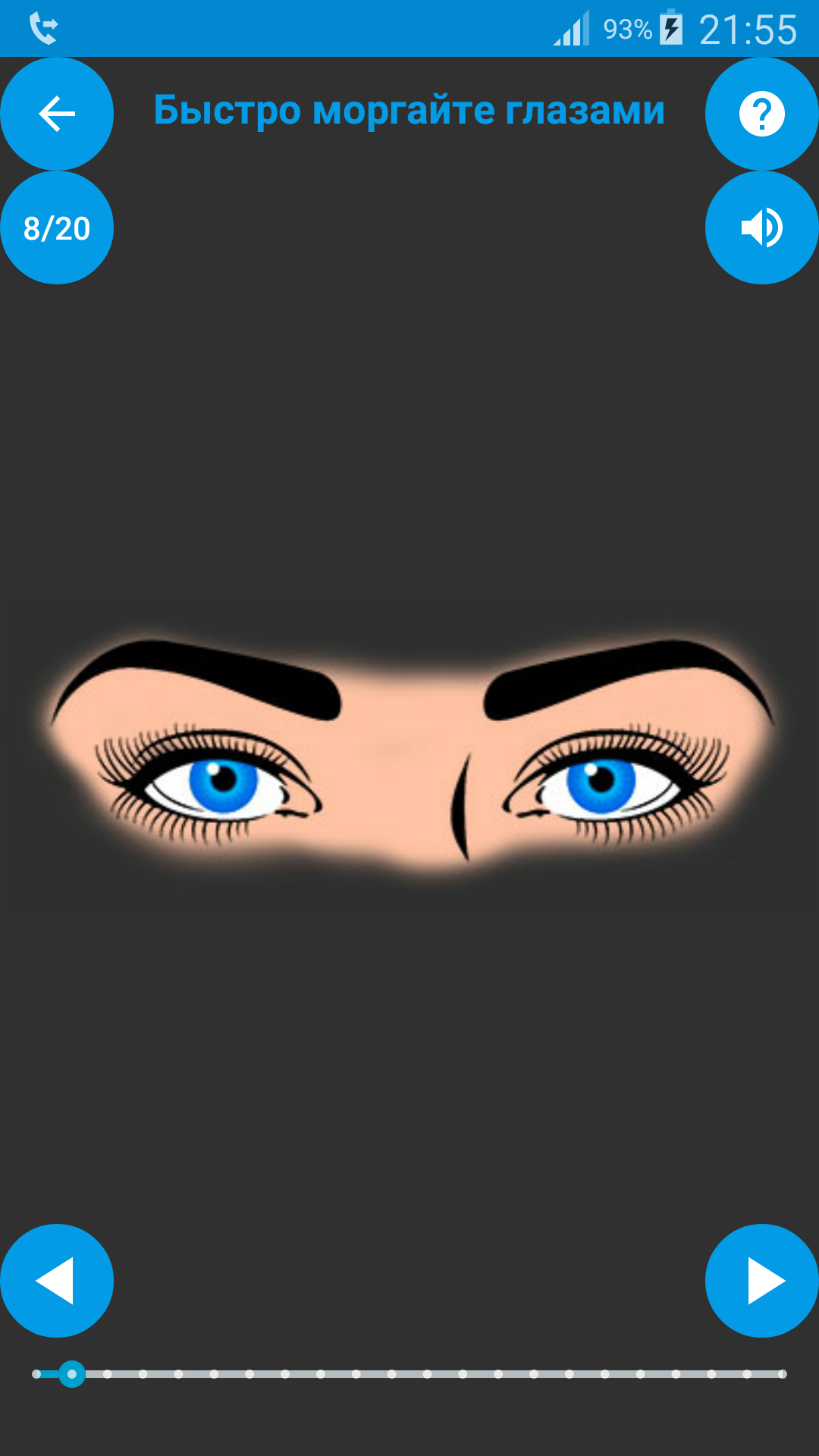 В приложении «Упражнения для глаз» собраны простые упражнения, такие как: движение глаз по спирали; влево-вправо; песочные часы. Верх лева право — диагональ низ и так далее; пальминг и так далее.