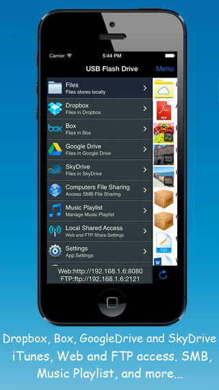 USB Flash Drive & File Transfer позволяет хранить, просматривать и управлять файлами на вашем iPhone, iPad или iPod Touch. Вы можете подключаться с любого компьютера по сети Wi-Fi и передавать файлы. Получите доступ к вашим Dropbox, Box, Google Drive или SkyDrive, чтобы загрузить, скачать файлы и многое другое, а также синхронизировать локальные папки. Обменивайтесь файлами между iPhone, iPad или iPod Touch, с помощью Wi-Fi или Bluetooth. Программа также включает в себя аудио воспроизведение.