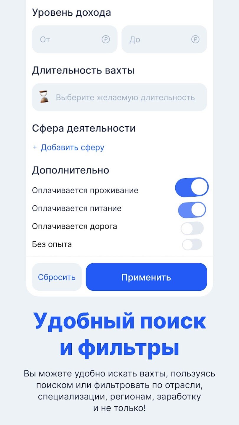 - Удобный поиск именно по вахтам. За пару кликов вы можете найти «Работа вахтой в Москве», «Работа вахтой cевер», «Работа вахтой в России», «Вахта для семейных пар», «Вахта без проверки СБ», «Вахта с оплатой трансфера», «Вахта с оплатой питания», «Вахта с оплатой проживания» и другое;
