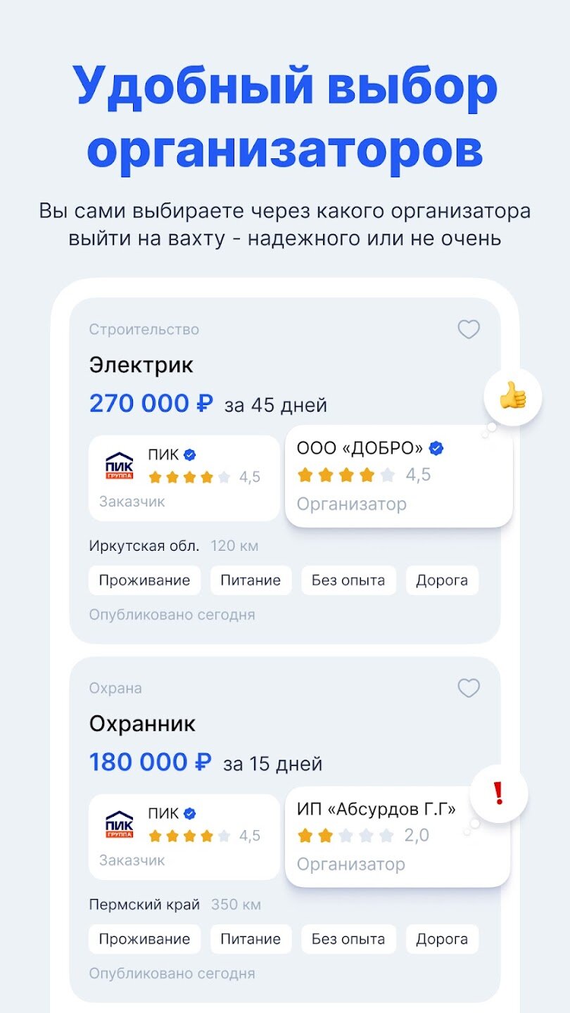 - Открытость и уважение: у ВахтаGO есть миссия — сделать работу вахтой доступной. ВахтаGO открыто показывает отзывы наших соискателей, чтобы любой соискатель мог принять решение, стоит ли выходить на работу в эту организацию или нет.