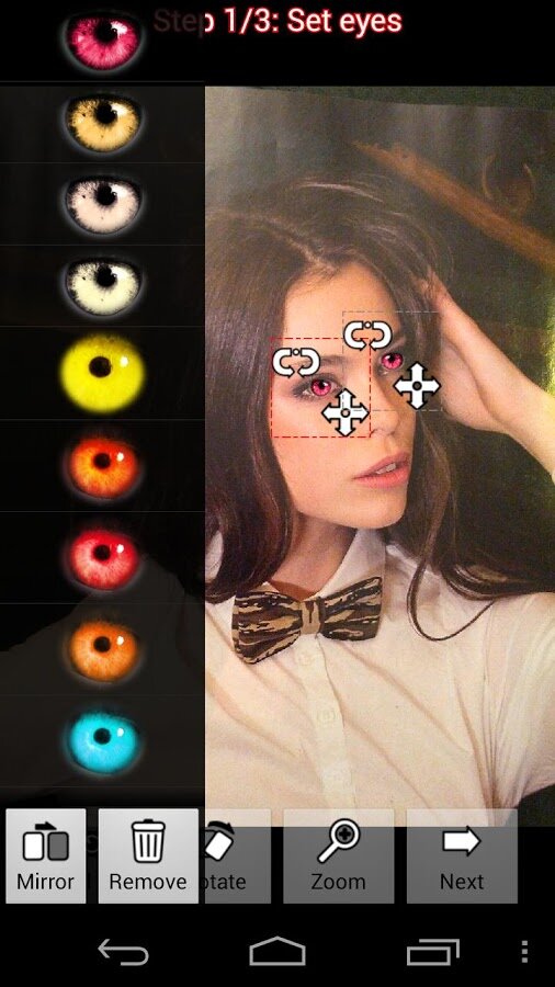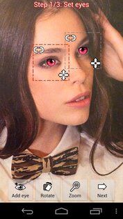 Выбрав фото из галереи или сделав отдельный снимок, пора приступать к созданию образа вампира. Программа сразу начинает с глаз. Необходимо подкорректировать автоматически выставленные радужки, изменив размер и местонахождение новых глаз на фотографии. Если на фото есть другие люди, легко добавить еще глаз, создав целую команду бледных вампиров, или наклеить себе на лоб третье око, как символ просвещения.