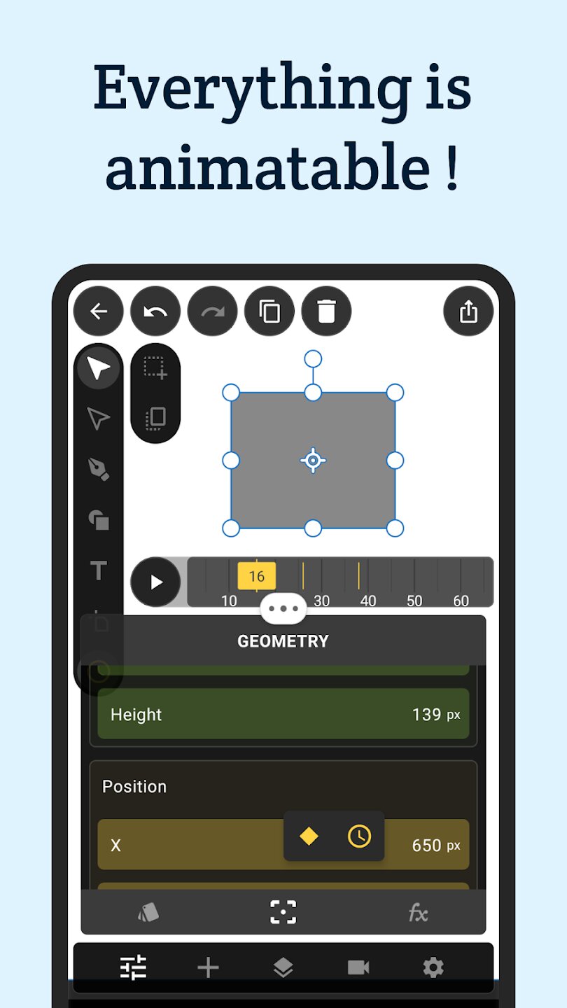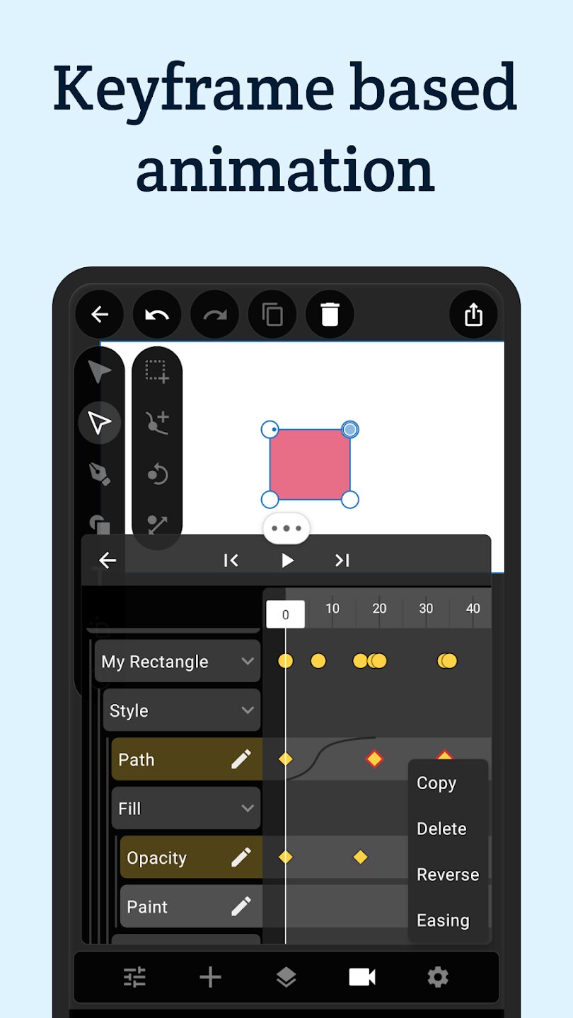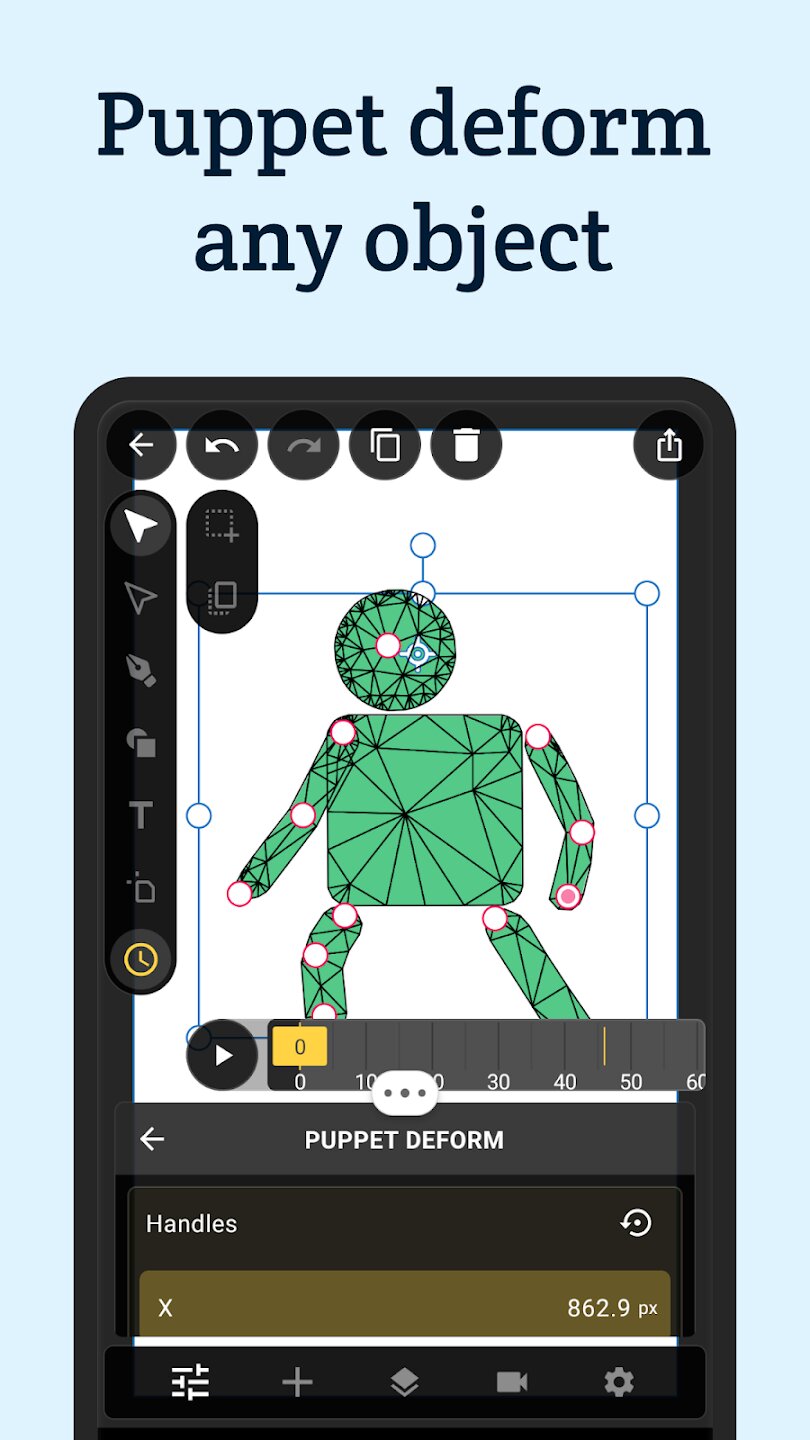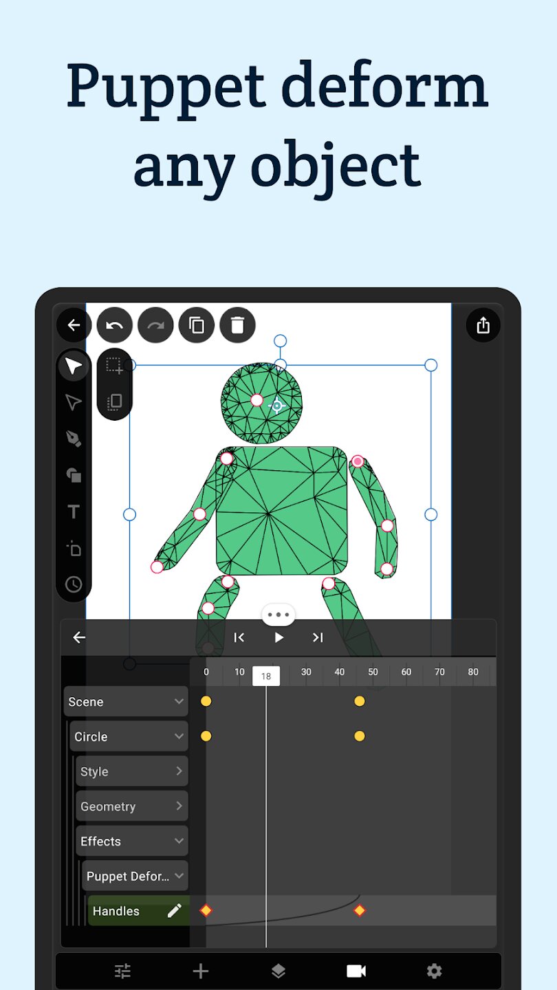 Приложение предлагает расширенную временную шкалу для точного управления анимацией, позволяя копировать, переворачивать и настраивать плавность ключевых кадров на всех слоях одновременно. Улучшайте свою работу с помощью широкого спектра профессиональных функций, включая эффекты слоев, такие как размытие и свечение, деформация марионеток для анимации персонажей, маскирование контуров, морфинг фигур и расширенные средства управления типографикой с поддержкой внешних шрифтов и текста на контуре.