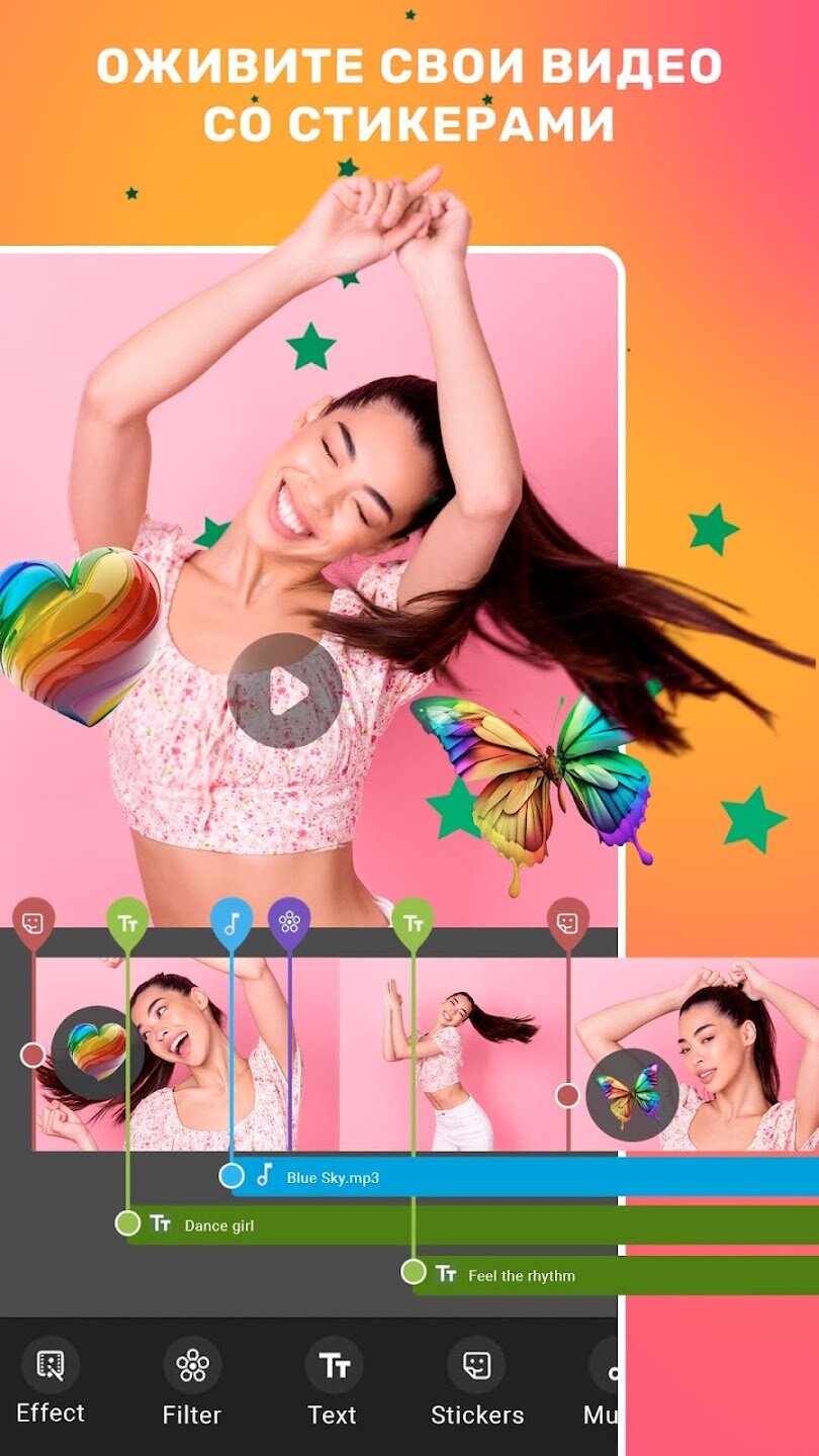 - Обширная библиотека анимированных шаблонов и видеоэффектов (глюк, неоновый свет, ретро и т. д.).