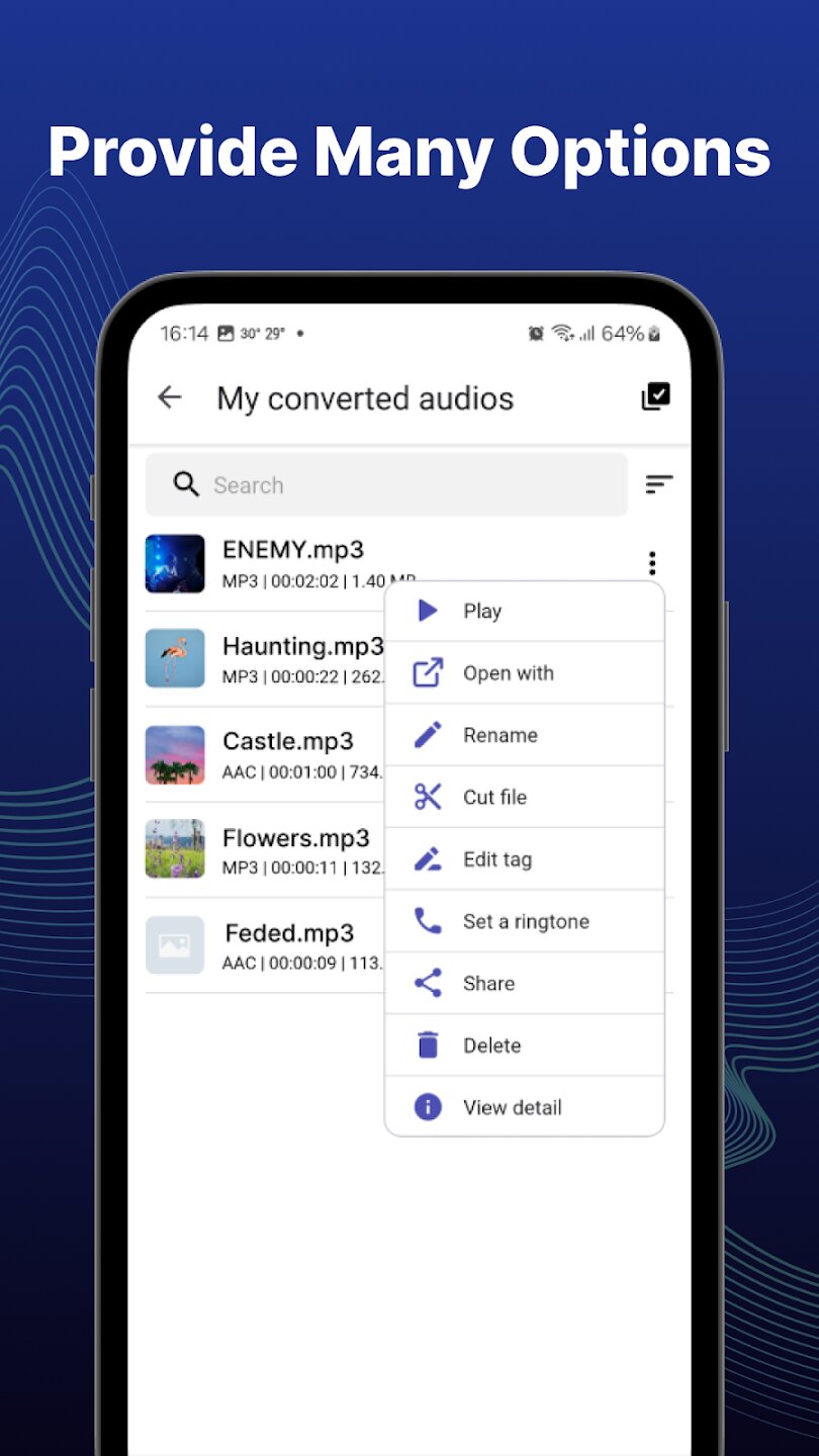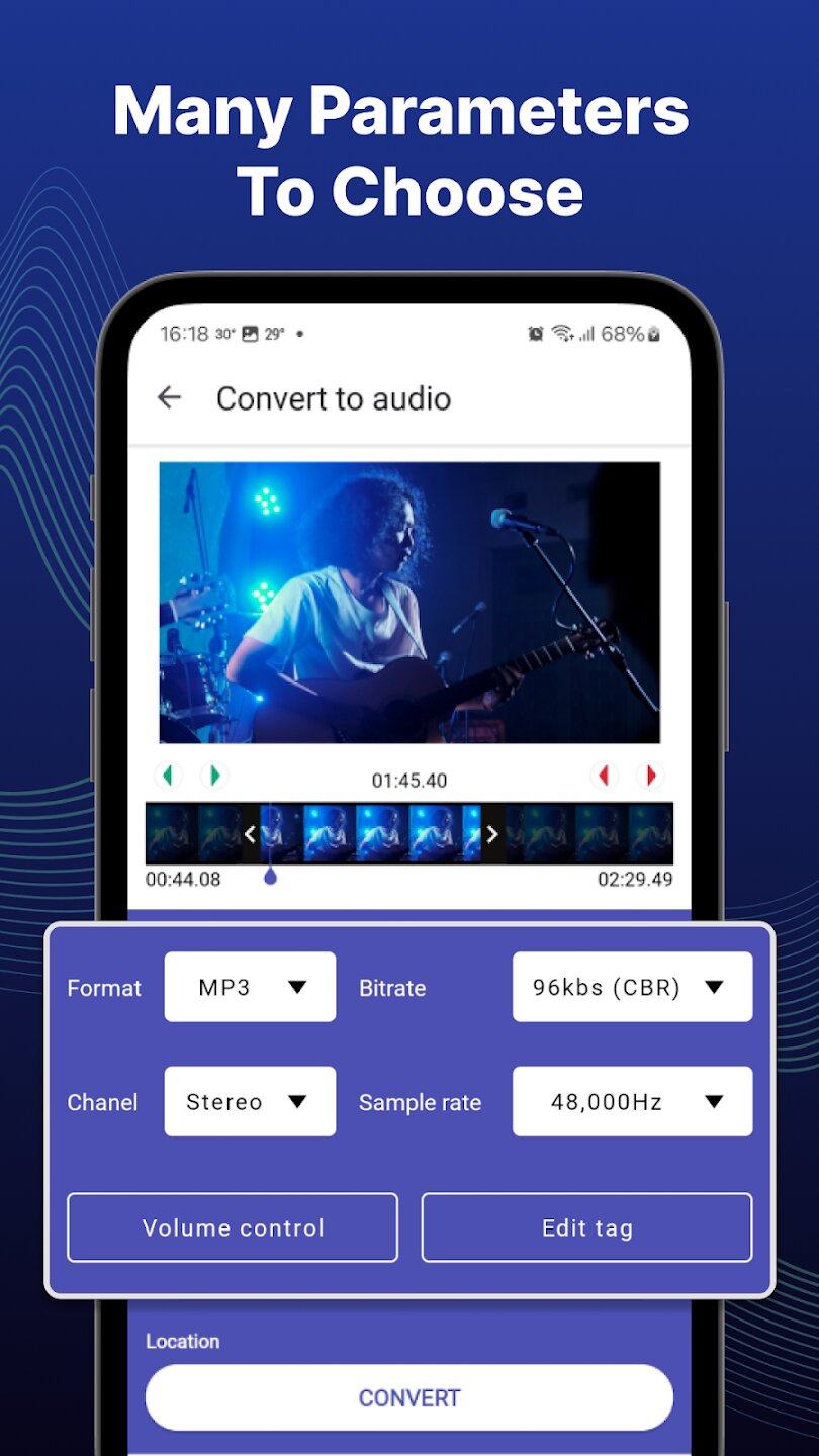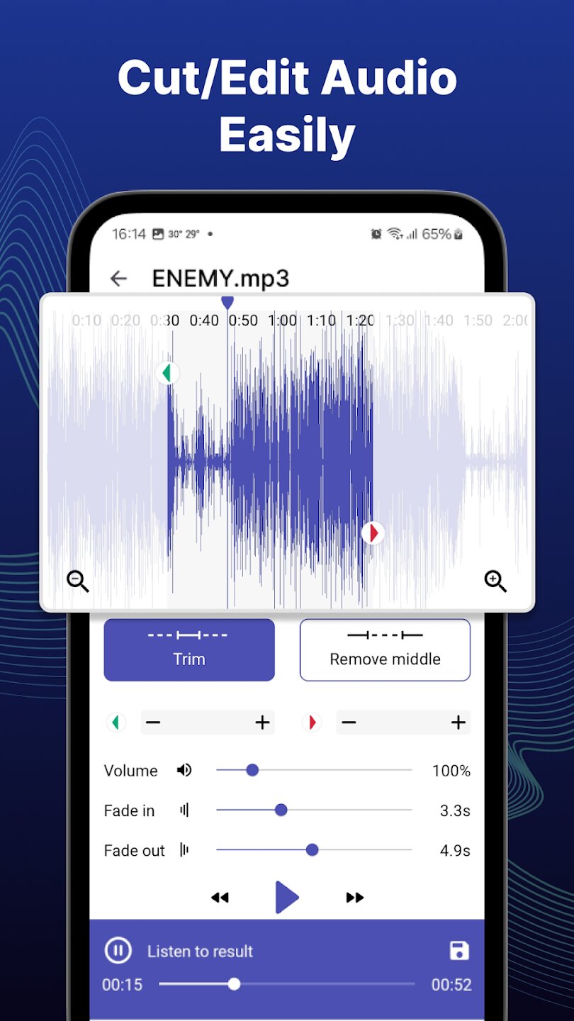 Этот инструмент позволяет преобразовывать ролики в популярные аудиоформаты всего за несколько касаний. Вы можете выбирать конкретный фрагмент видео, настраивать параметры звука и сразу же слушать результат. Приложение поддерживает все распространенные видеоформаты, включая MP4, AVI, MOV и даже редкие расширения вроде OGV или FLV.