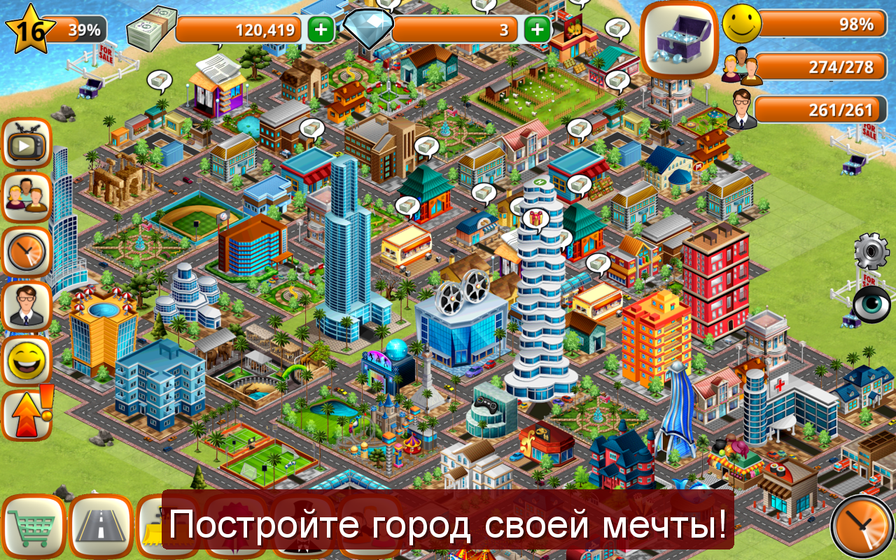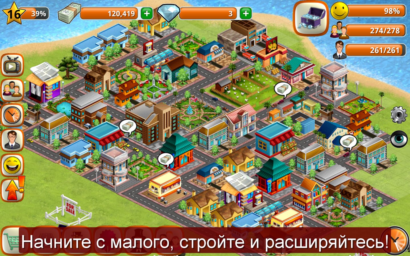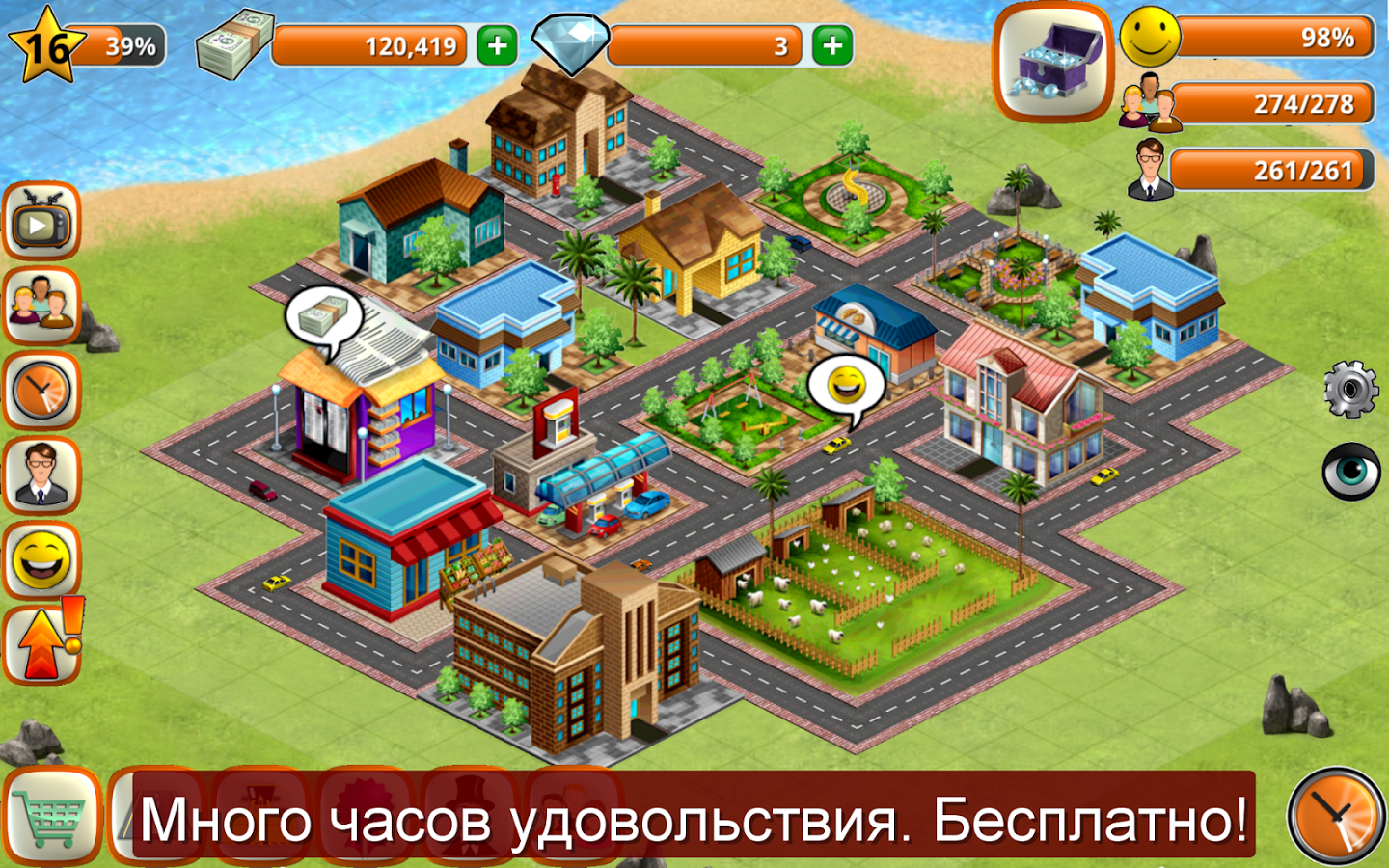 Village City Island Sim — вы будете строить дома для жителей, украшать их, возводить общественные здания, создавать рабочие места. Жители будут зарабатывать для вас деньги! Постройте бизнес-империю! К вашим услугам — более 85 уникальных зданий: отелей, кинотеатров, офисов, пекарен, ресторанов и даже нефтяных платформ. На лодках рыбаки могут ловить рыбу. Сделайте жизнь своих жителей комфортной! Стройте для них парки, школы, церкви, библиотеки, музеи и даже колесо обозрения. В игре важно соблюдать баланс: высокий уровень жизни привлекает новых жителей, для которых нужно строить дома и давать им работу