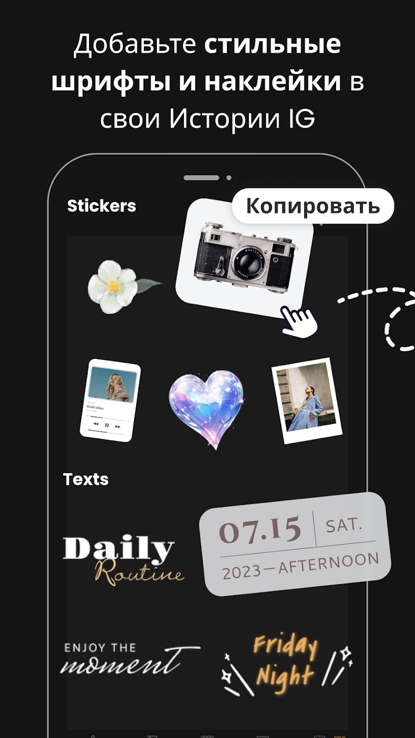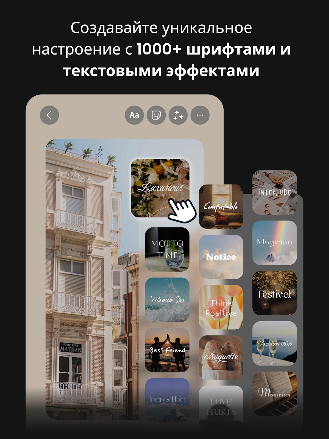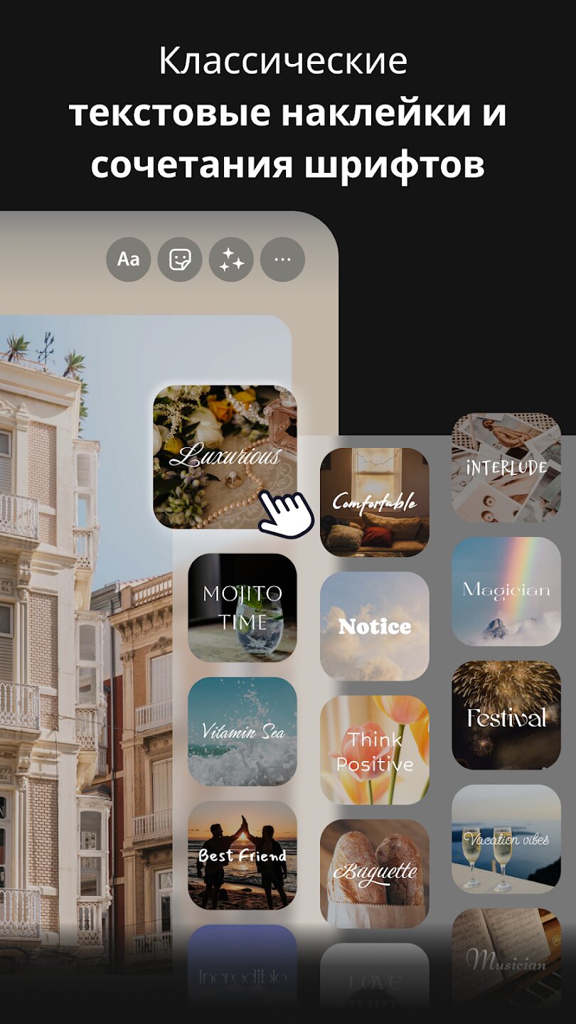 - Обширная библиотека из более чем 1000 эстетичных стикеров, текстовых эффектов и отобранных GIF-файлов.