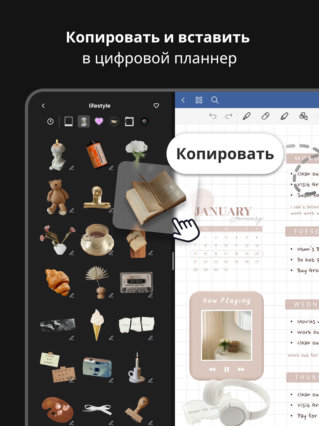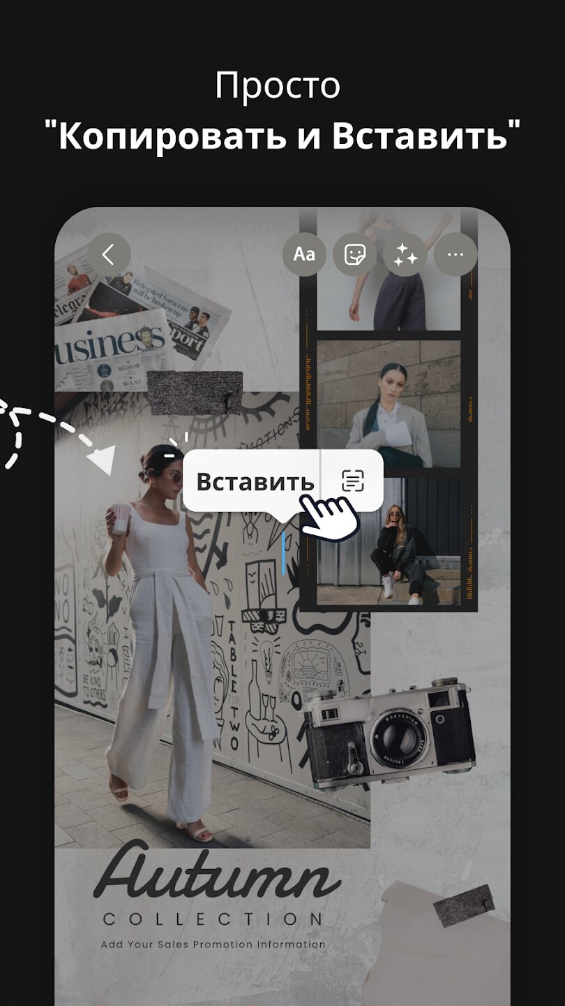 Приложение позволяет легко копировать и вставлять элементы прямо в другие приложения, такие как Instagram* или CapCut. Вы можете организовывать избранное, сохранять готовые стили дизайна для единого брендинга и получать доступ к обширной библиотеке с более чем 1000 эстетичных стикеров, модных GIF-файлов и редактируемых шаблонов видео. Его удобный подход основан на простом трехэтапном рабочем процессе: скопируйте из Vivisticker, вставьте в целевое приложение и мгновенно оформите свой контент.