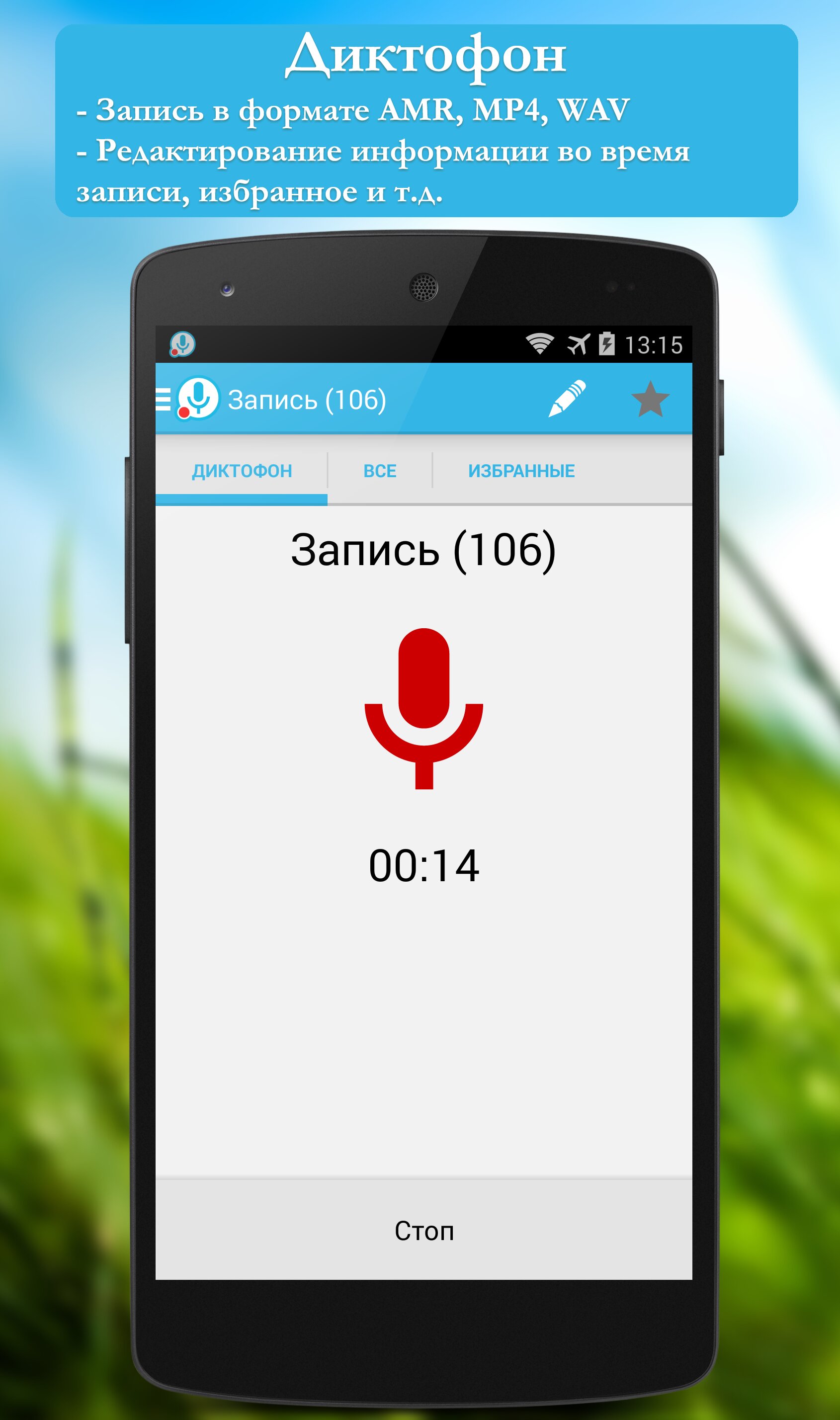 • Запись в формате «amr», «mp4», «wav» с возможностью выбора качества записи